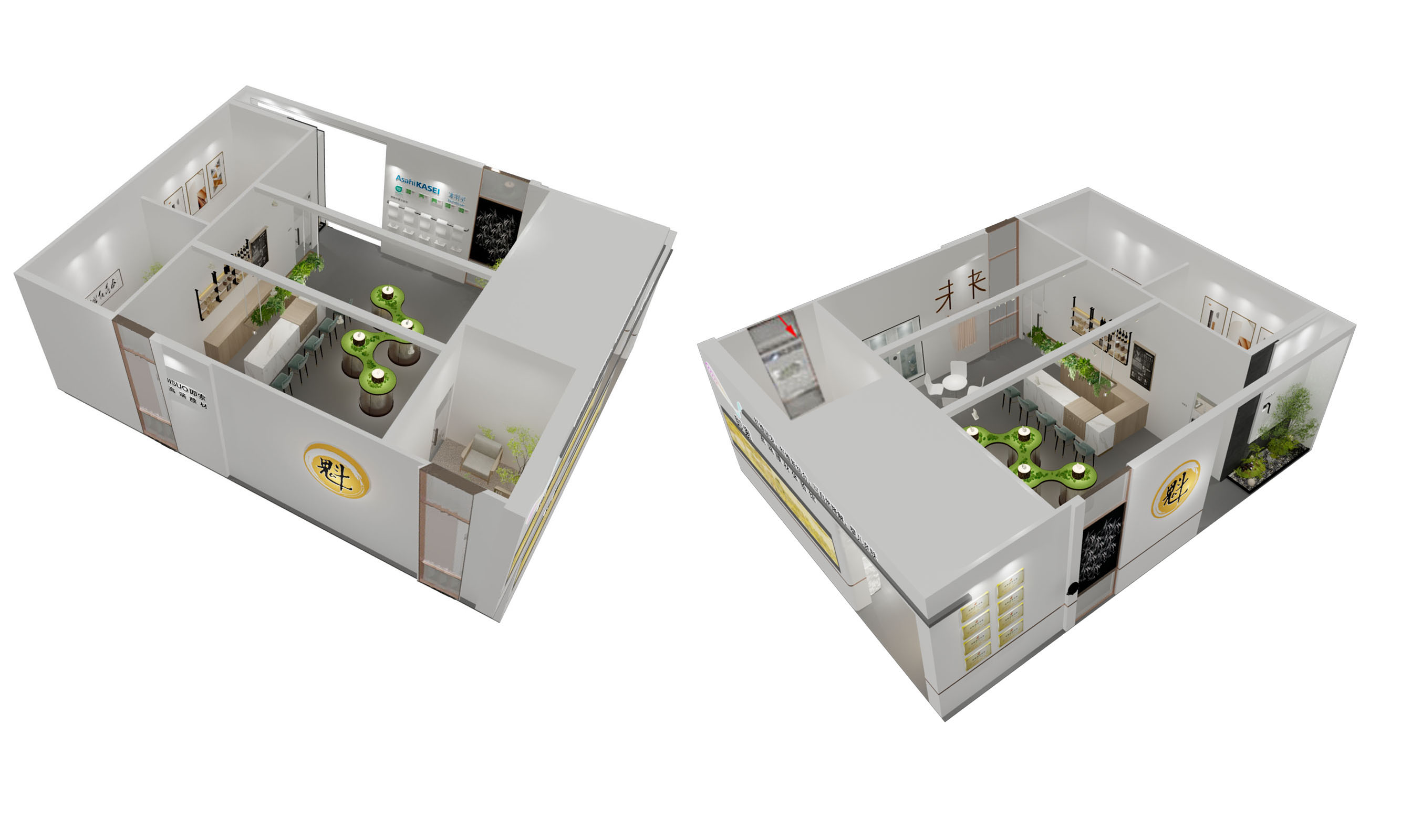 轻奢风格展台,展台功能区分为接待区、洽谈区、产品展示区、多媒体展示区、储藏室、茶水休闲区。展台设计用古典装饰元素融入现代展陈,传统工艺和现代元素的呼应让整个空间满是雅致感
