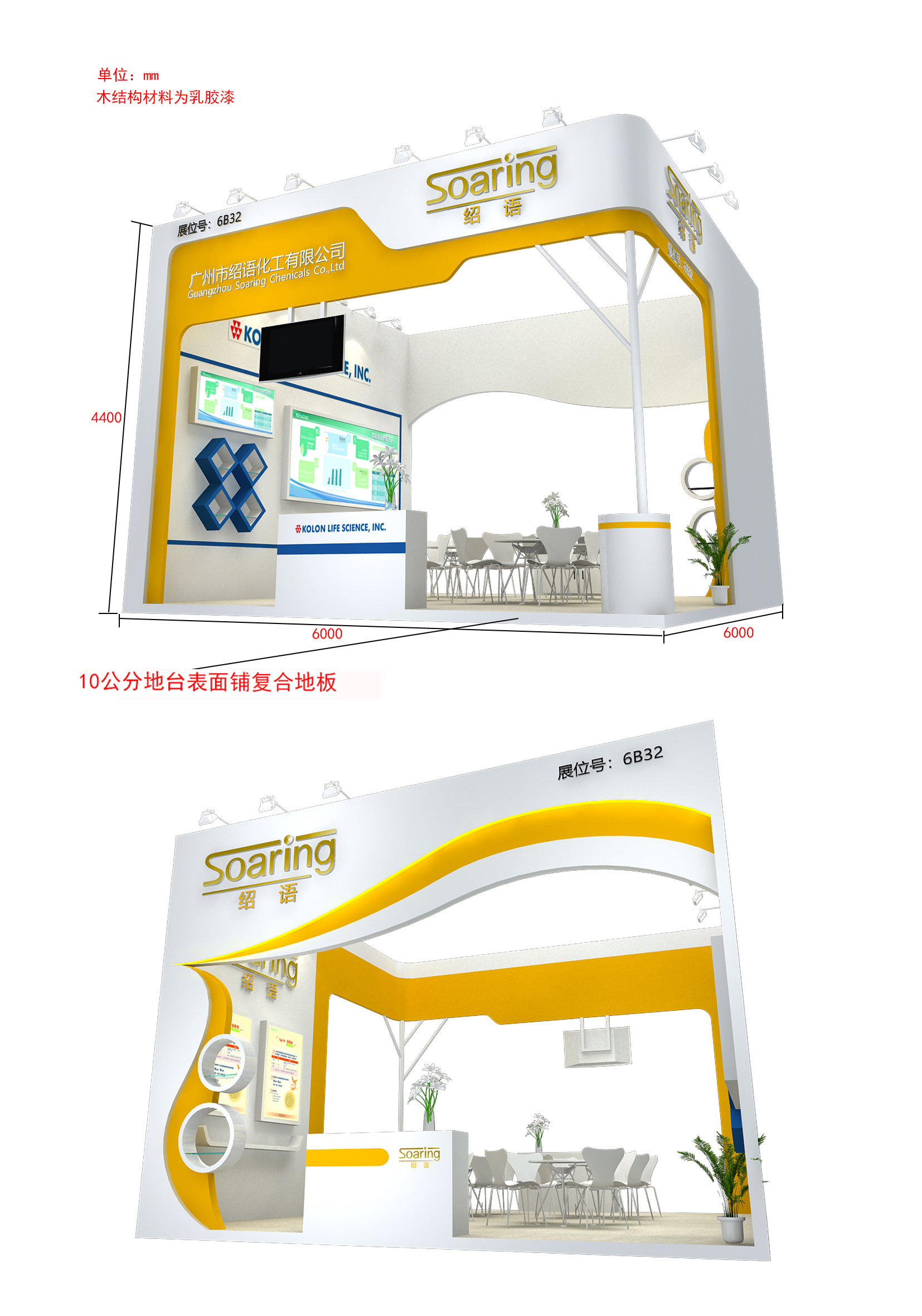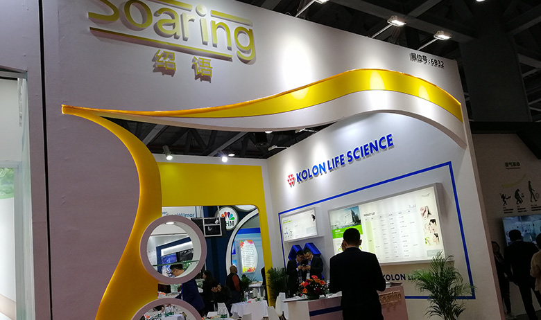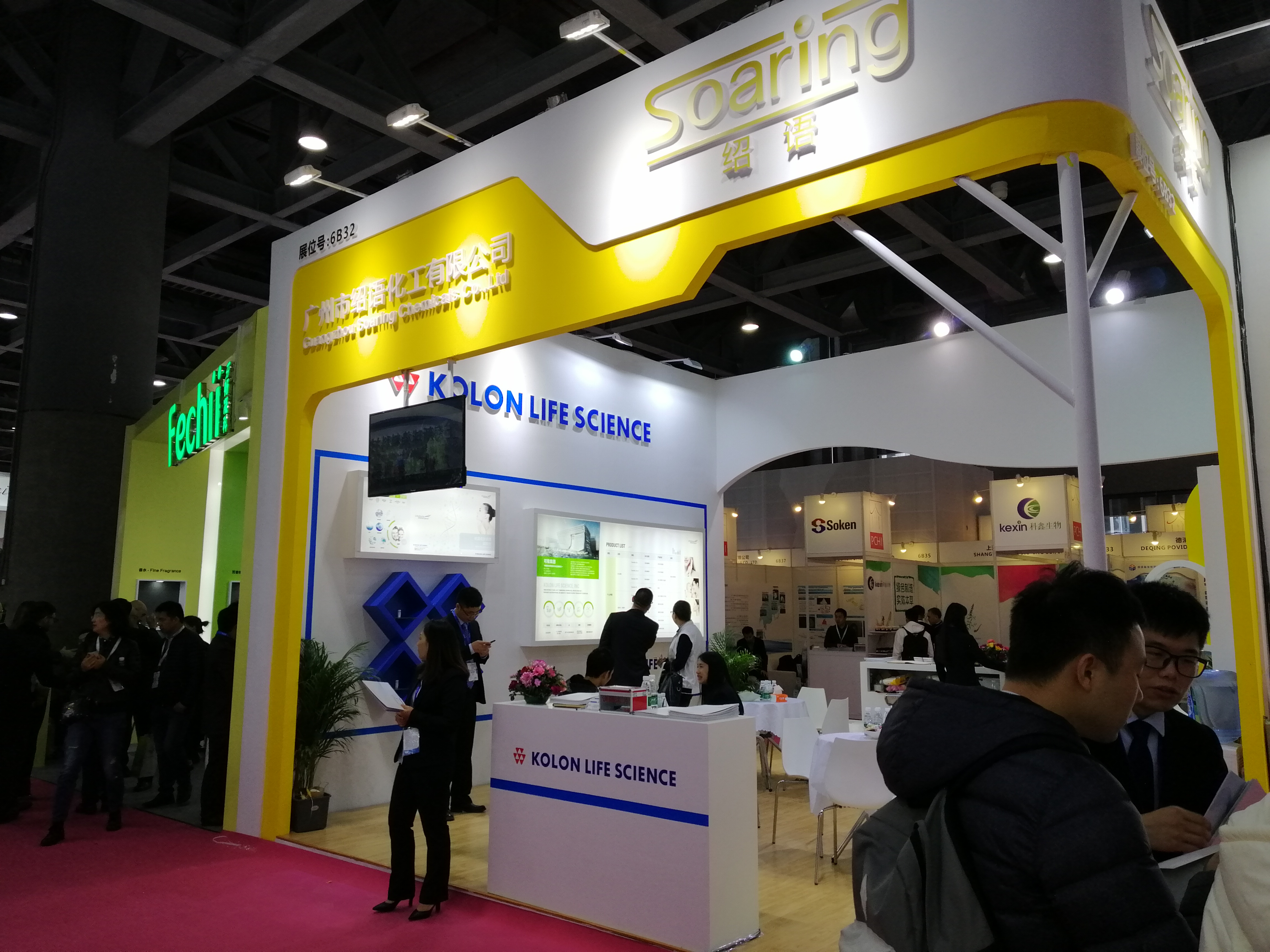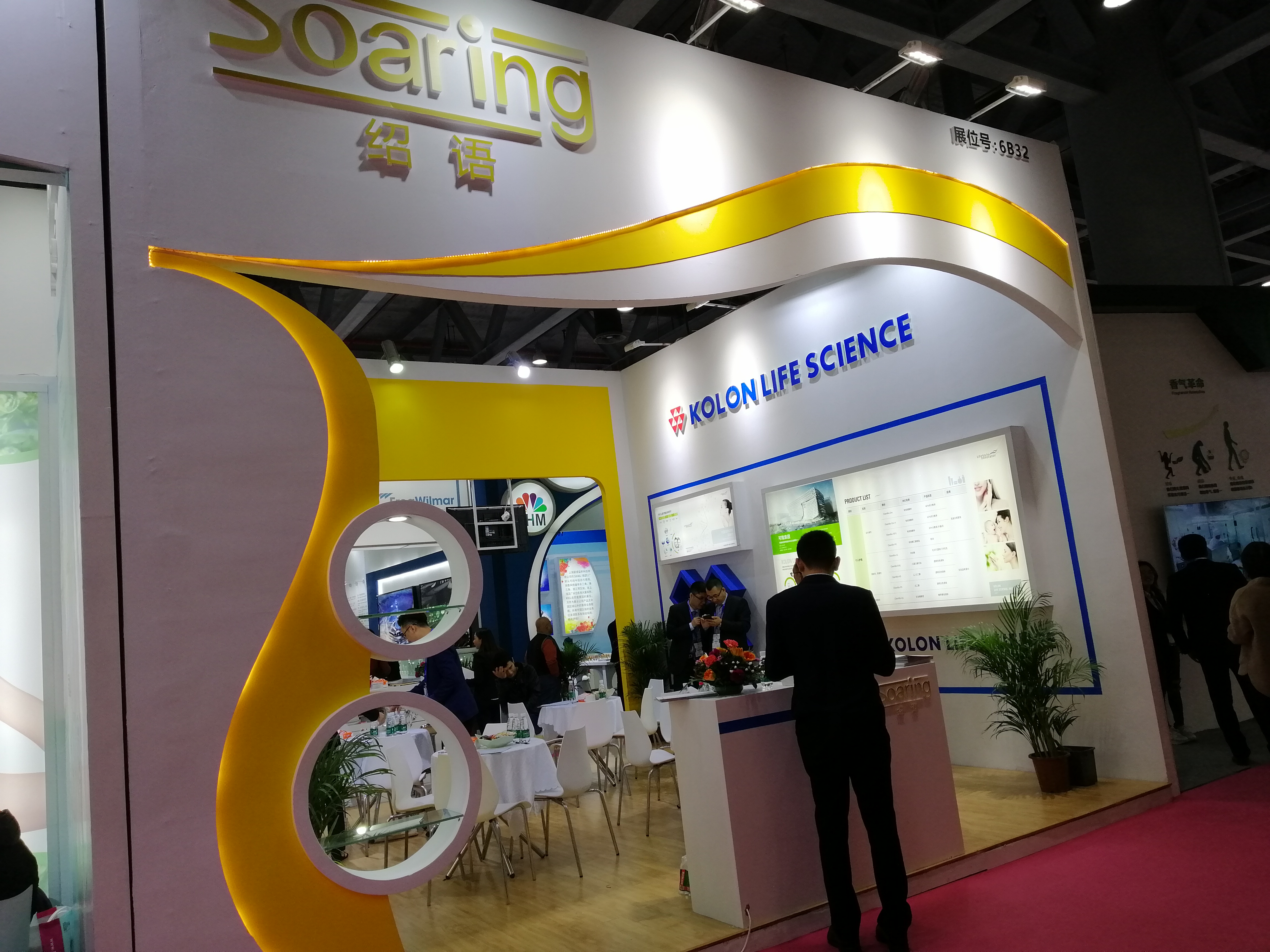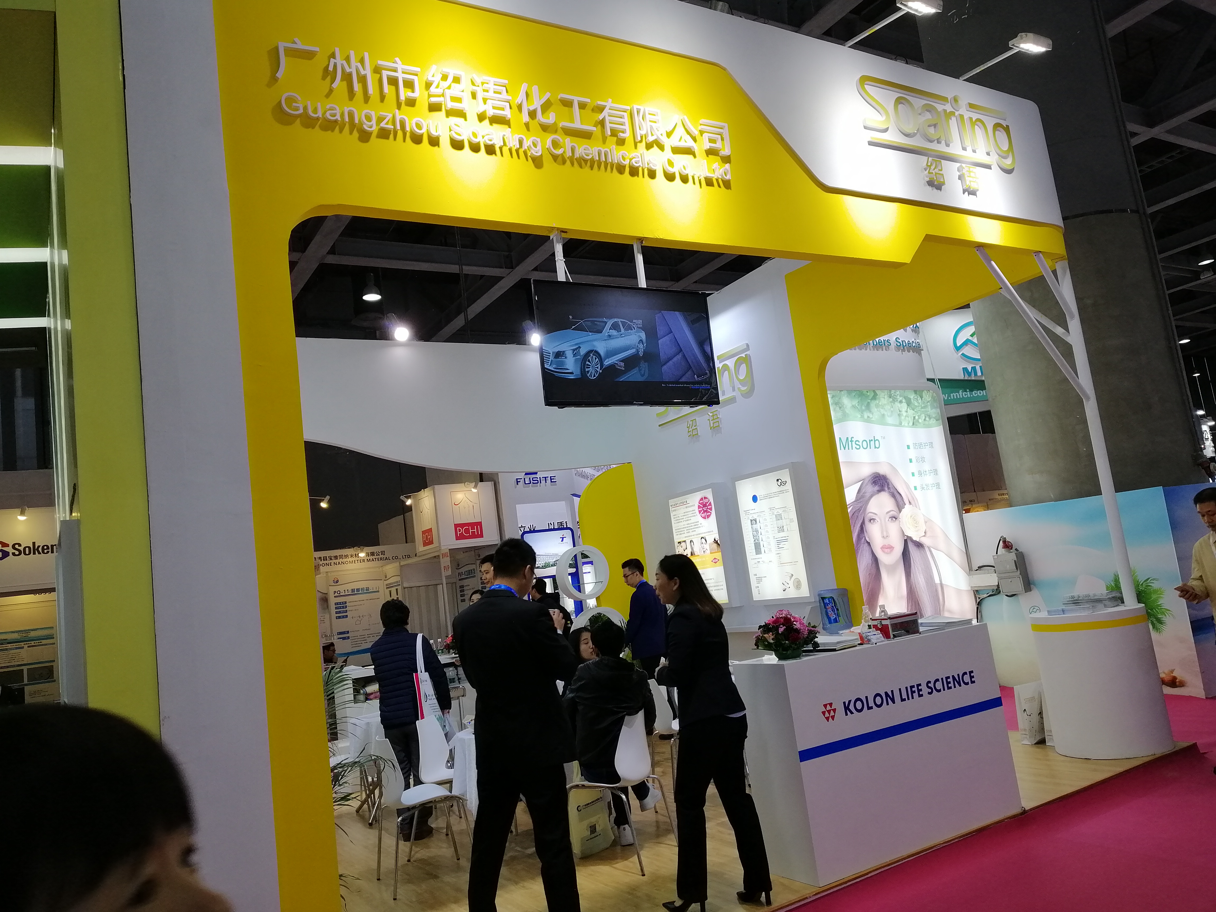 PCHi化妆品原料展会设计搭建,该展台功能区域包含接待区、洽谈区、品牌展示区。