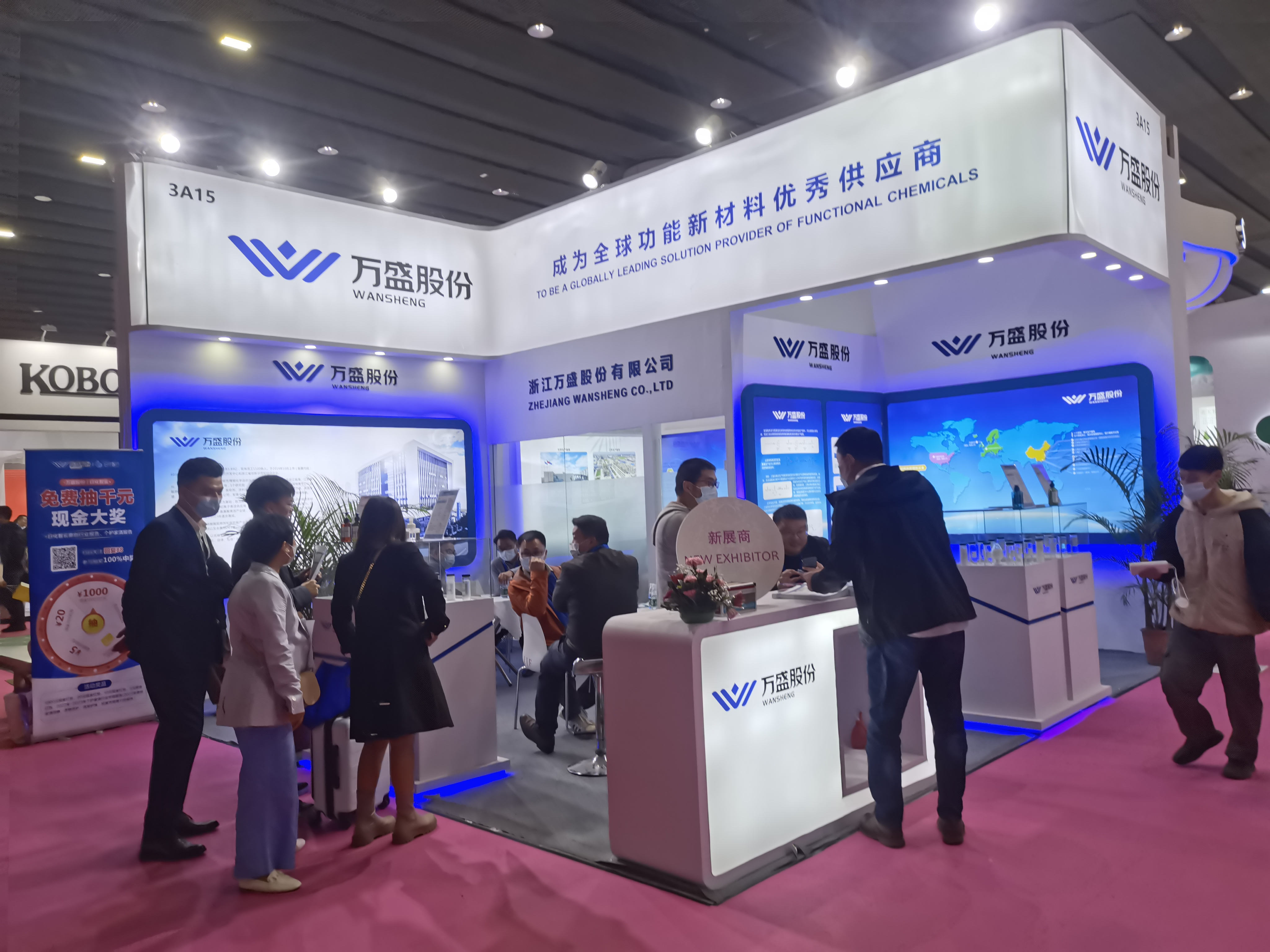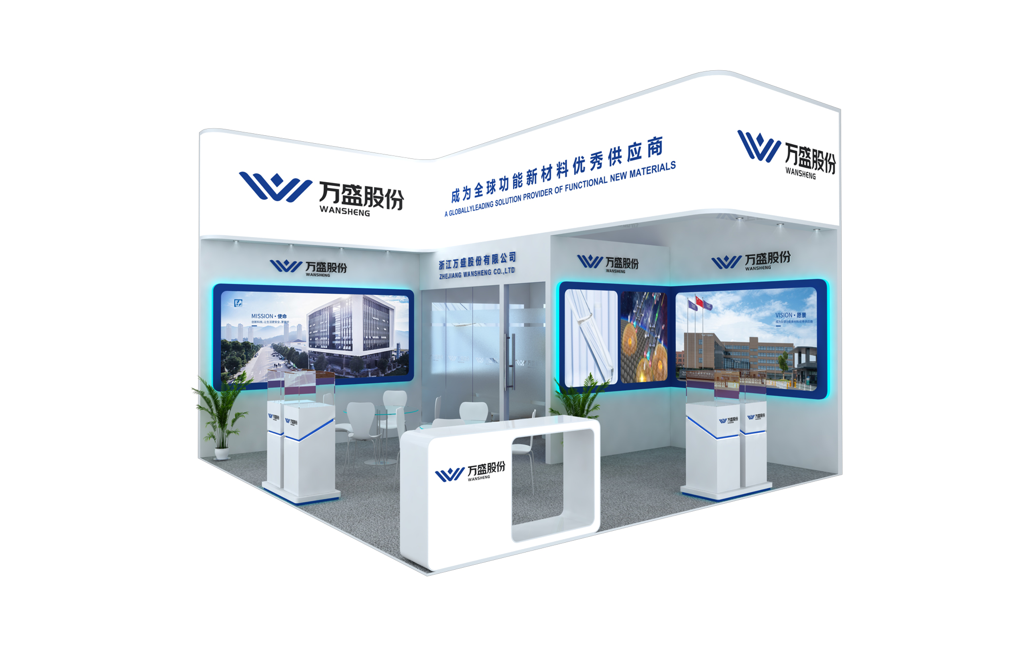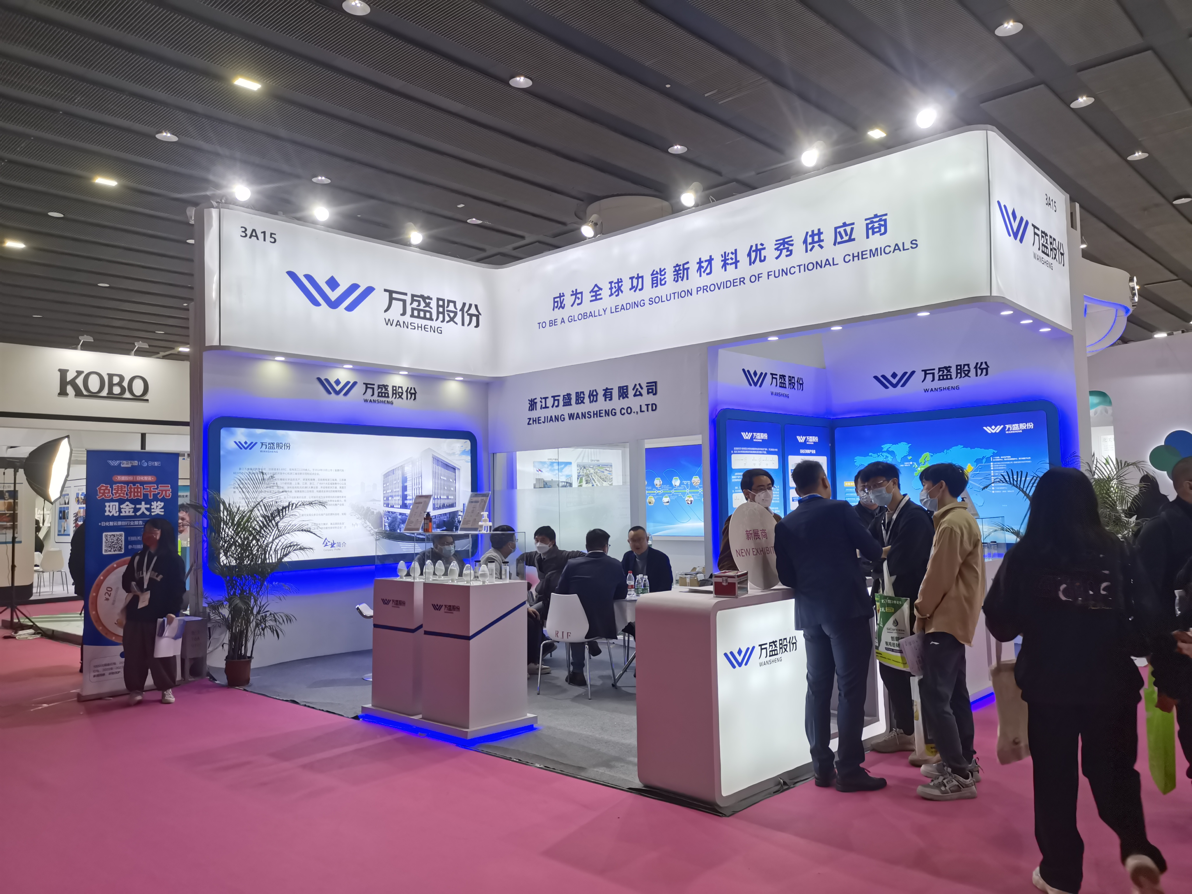 PCHi化妆品原料展会设计搭建,该展台功能区域包含接待区、洽谈区、存储区、品牌展示区、产品展示区