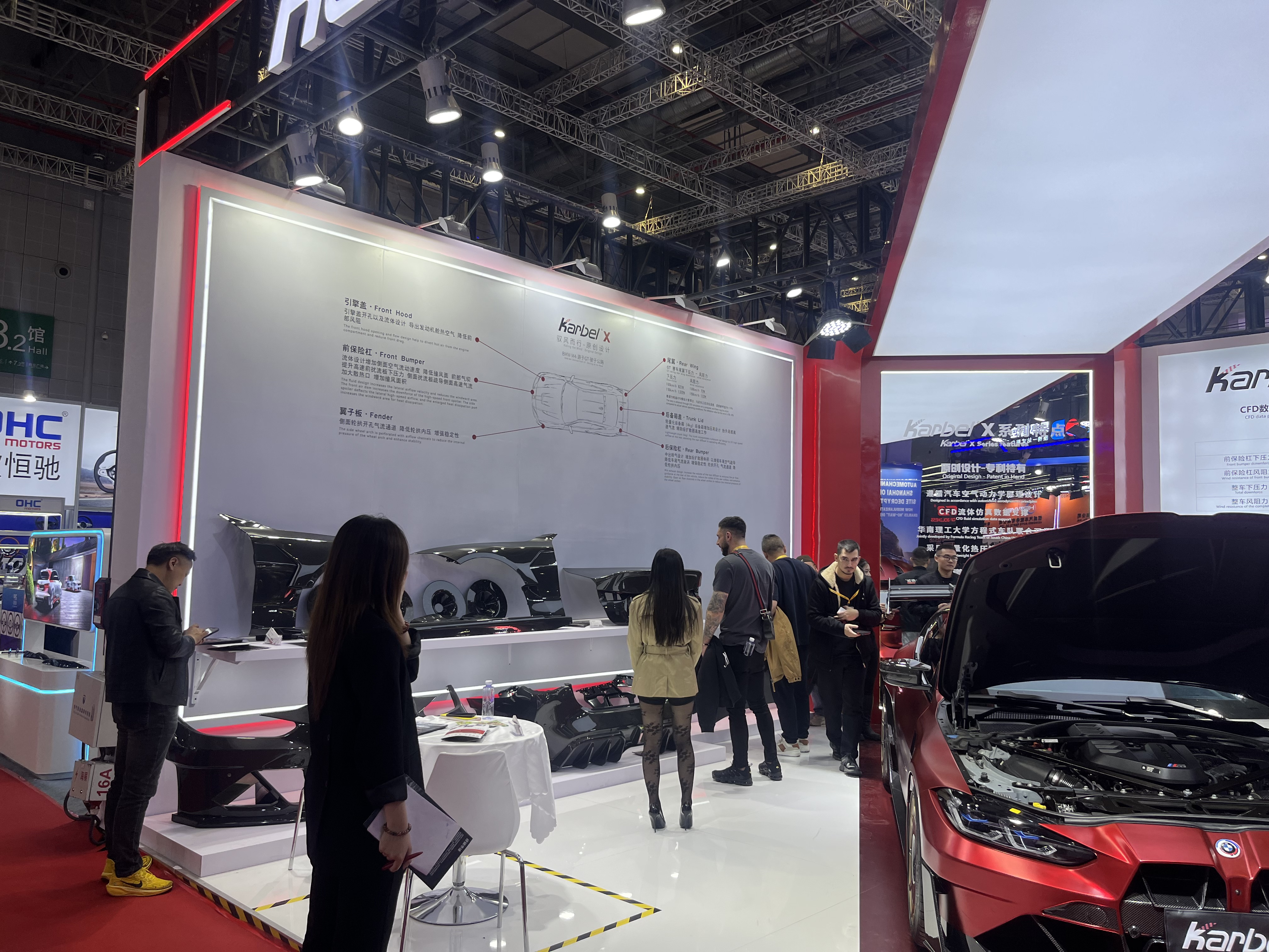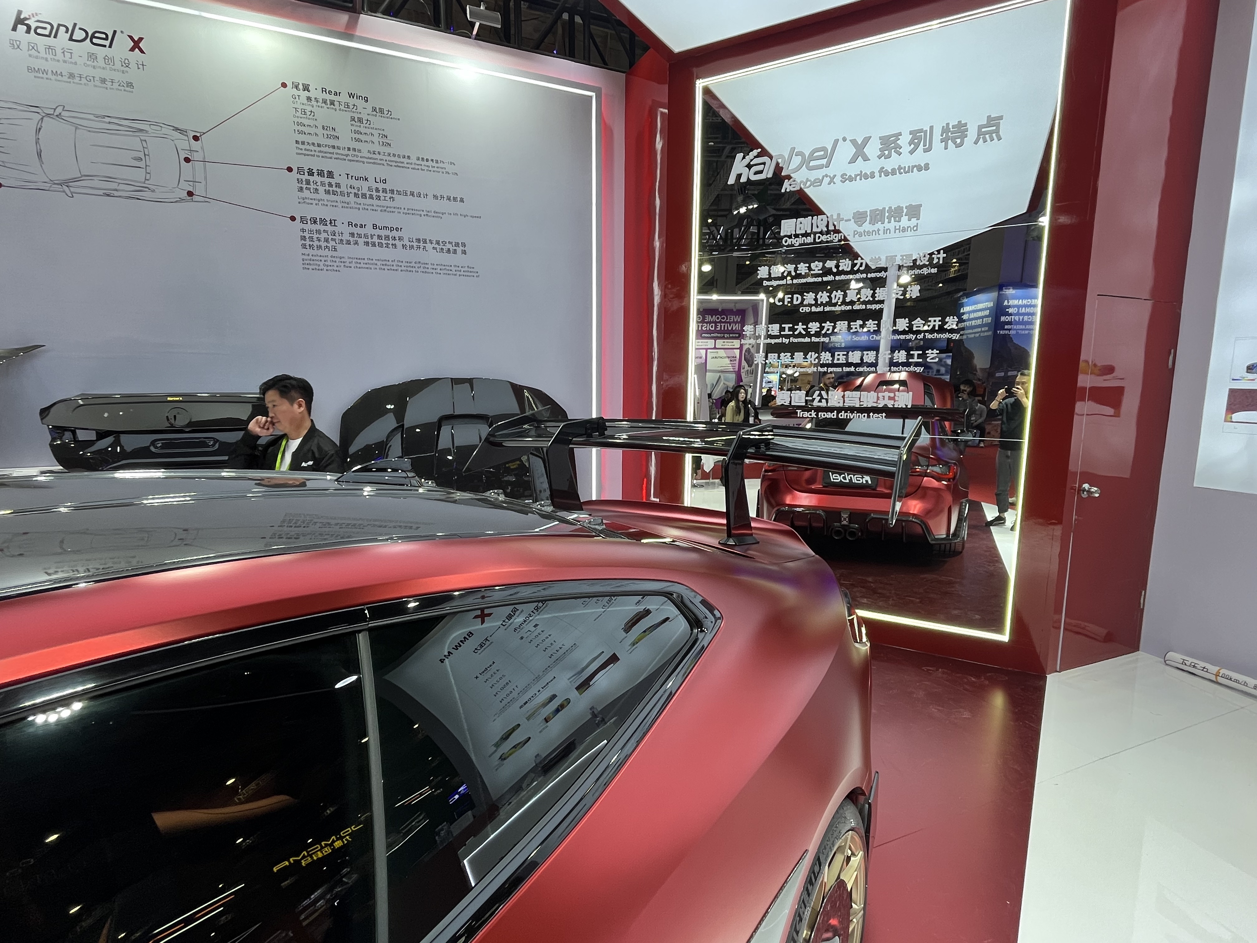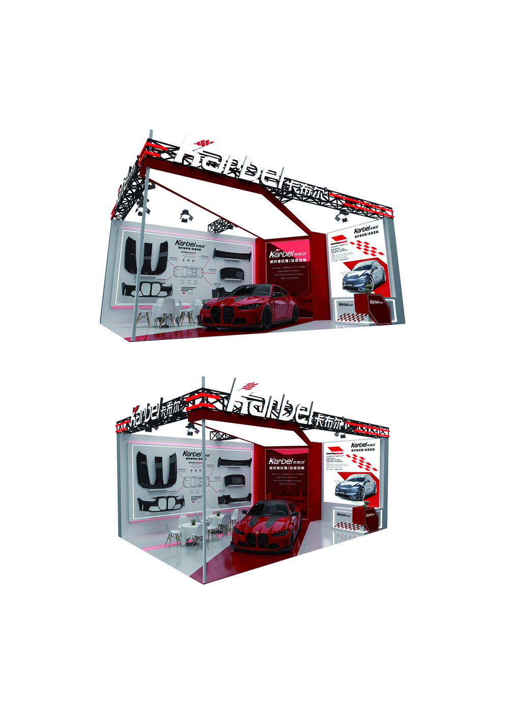 红色淋油板地面精准框住 C 位改装红车,白色区域延伸空间感,顶部软膜灯箱如聚光灯,同时与地面线条相呼应