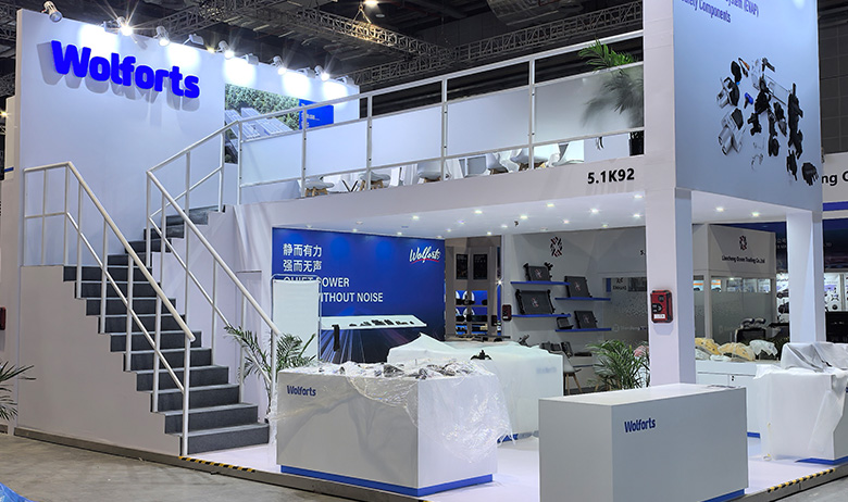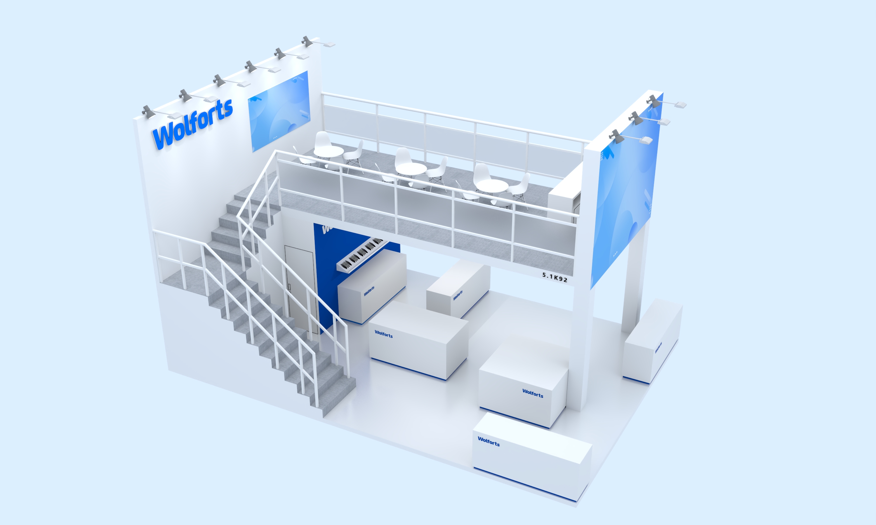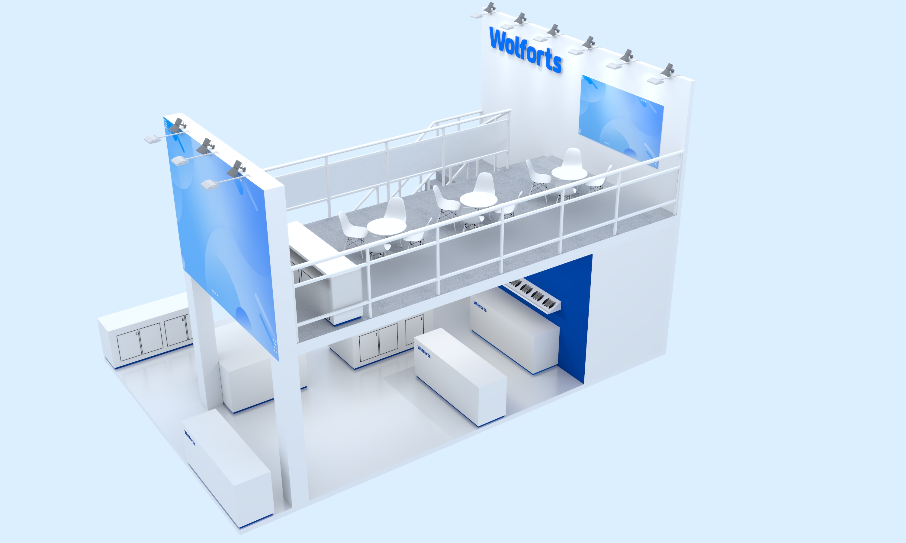 上海展会设计搭建,展台设计呈现简约现代风格,一层作为全开放产品展示区,充分利用三面开口的优势,让观众可从多角度浏览产品;二层被设计成舒适的洽谈区,向上拓展空间