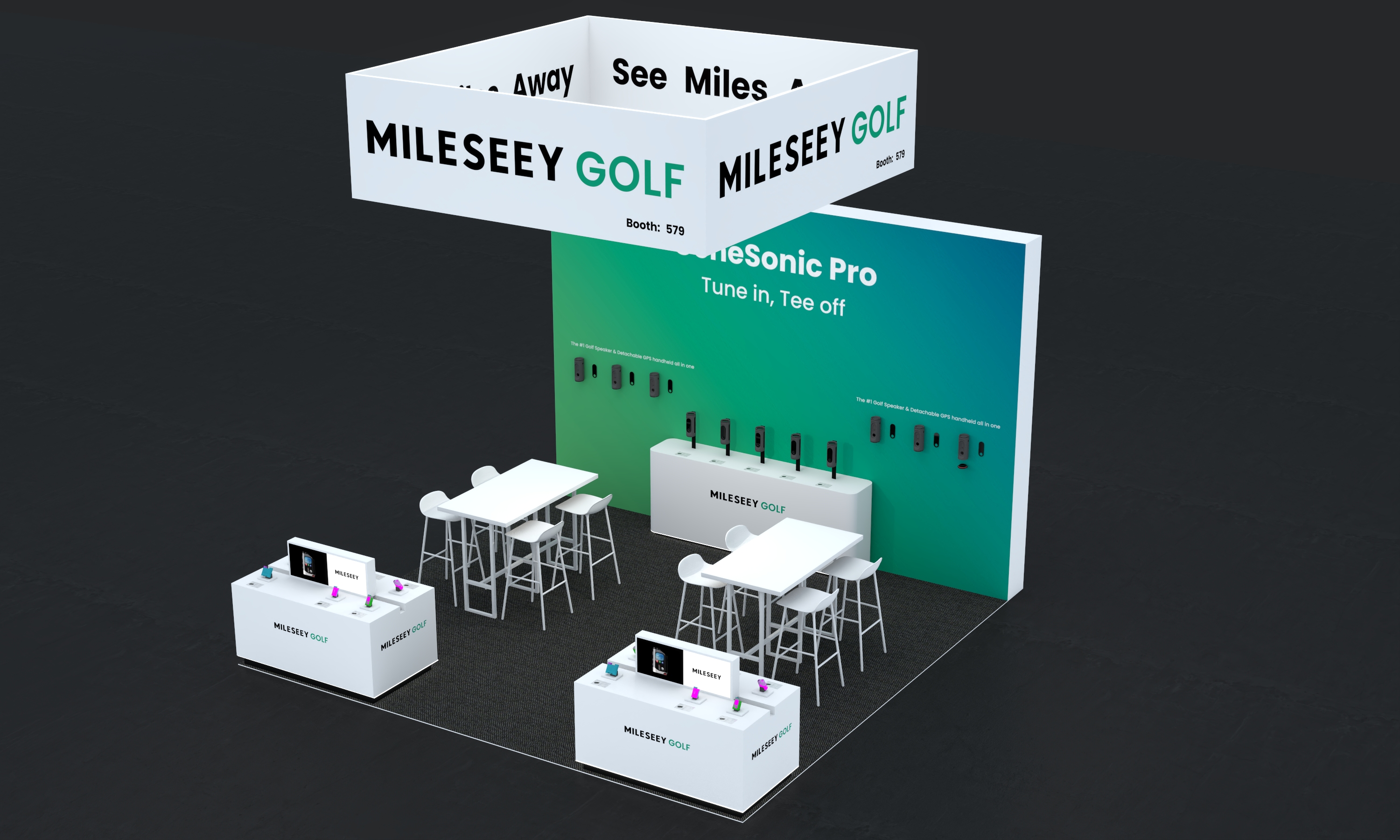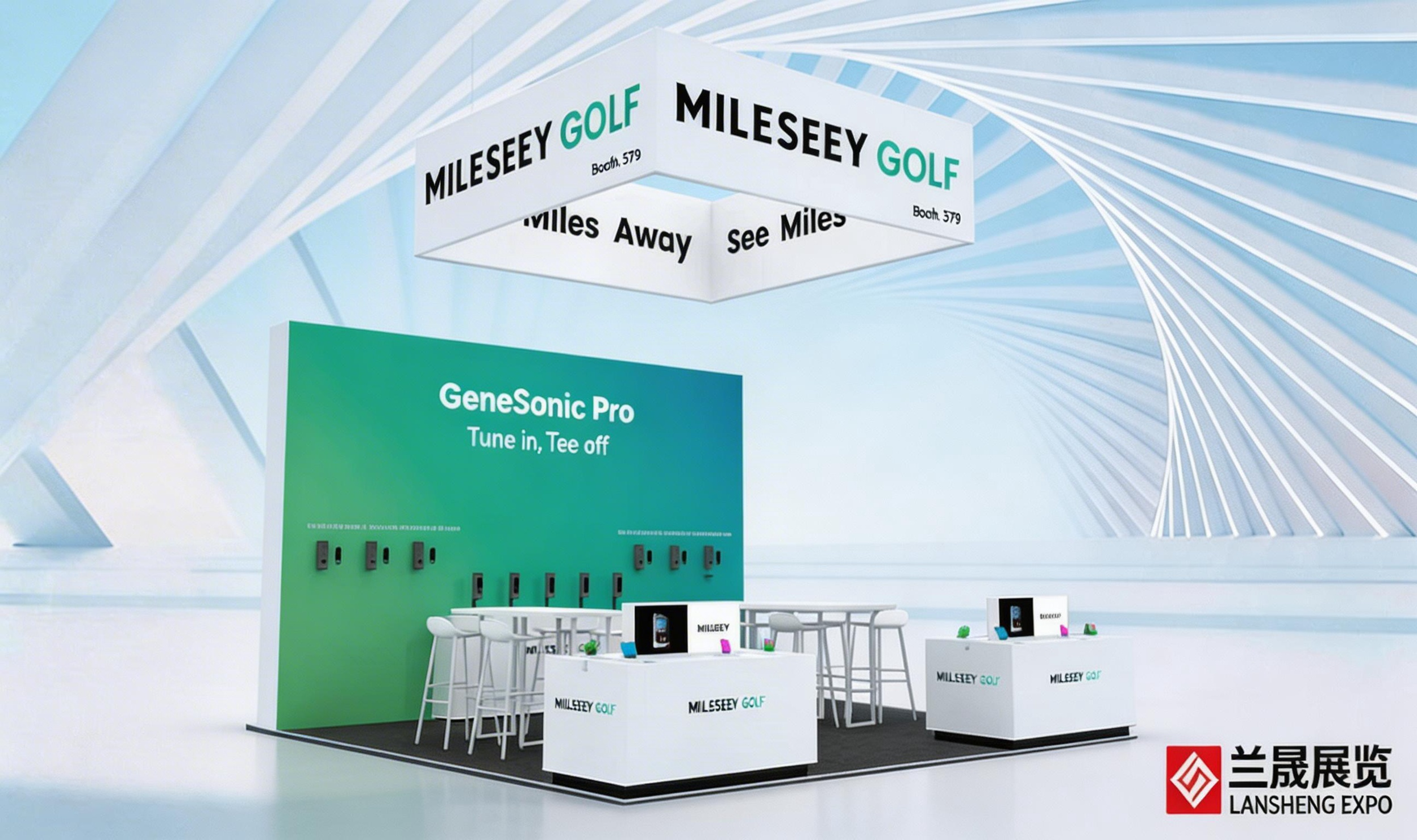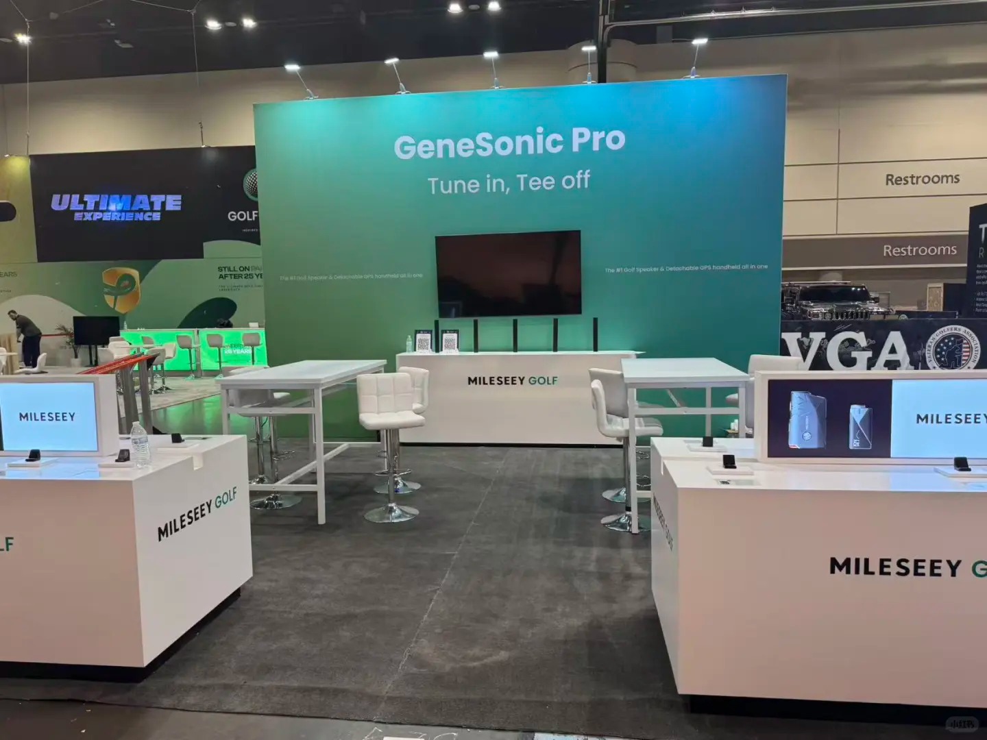 美国展台设计搭建,展台采用吊顶结构设计,纵深拓展展台视觉空间,在人潮涌动的PGA展会现场,观众能快速捕捉到品牌