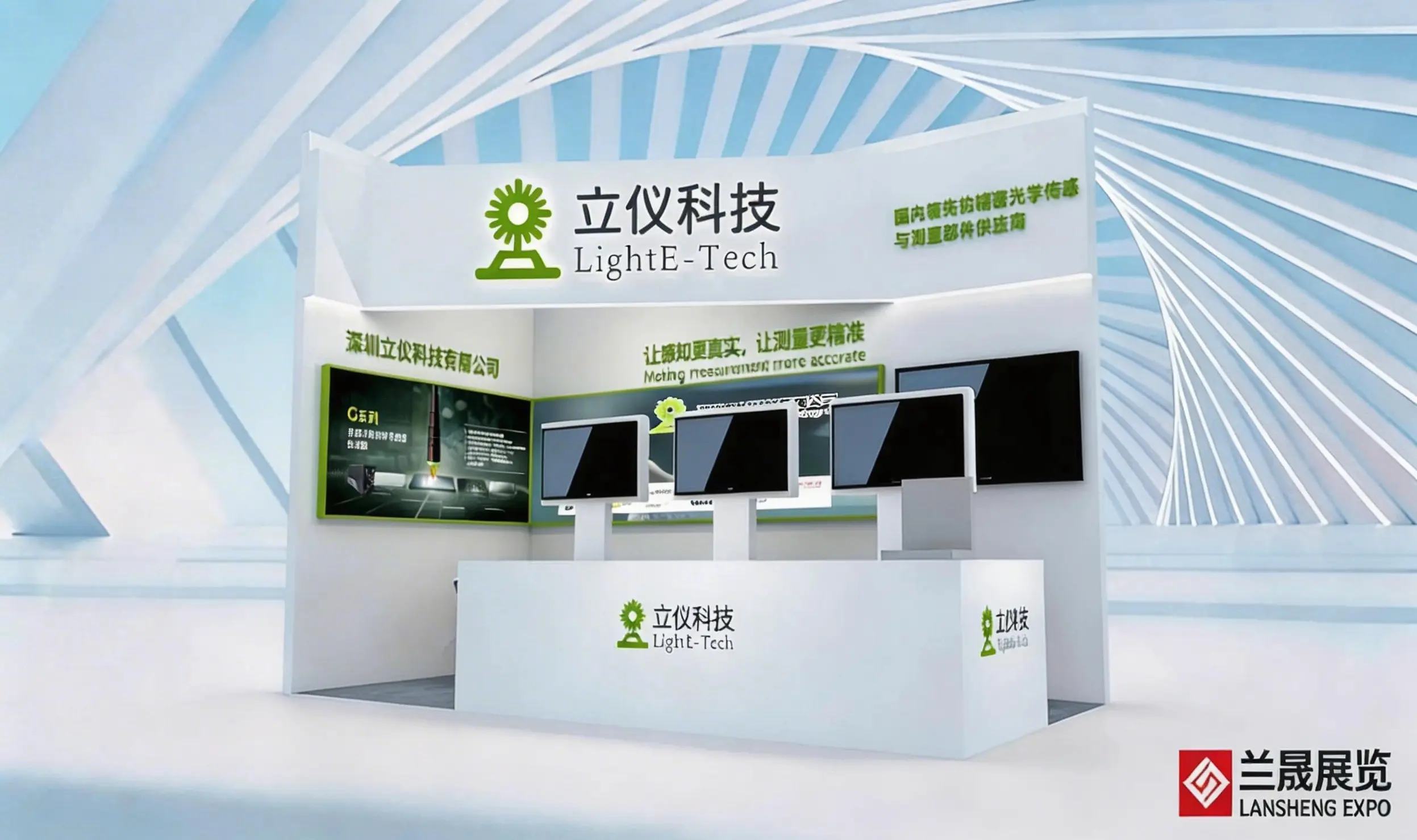 慕尼黑光博会展台设计搭建,针对有空的展示空间,在一张立满6个显示屏幕的展示柜完成所有产品的体验,节省展台空间