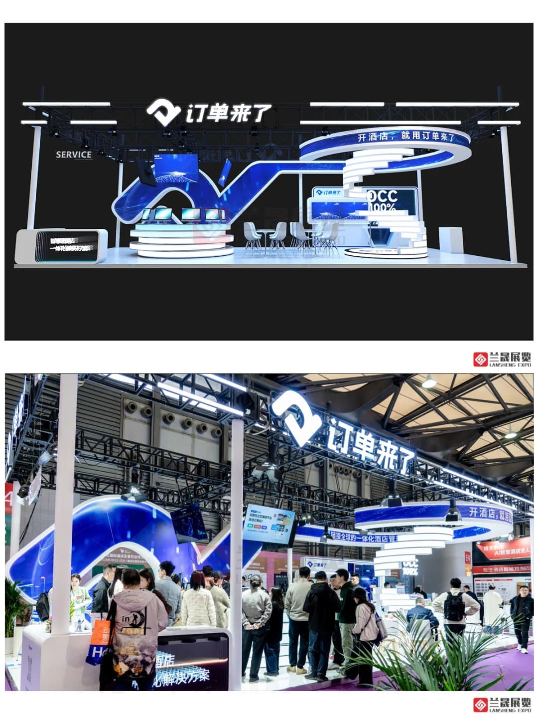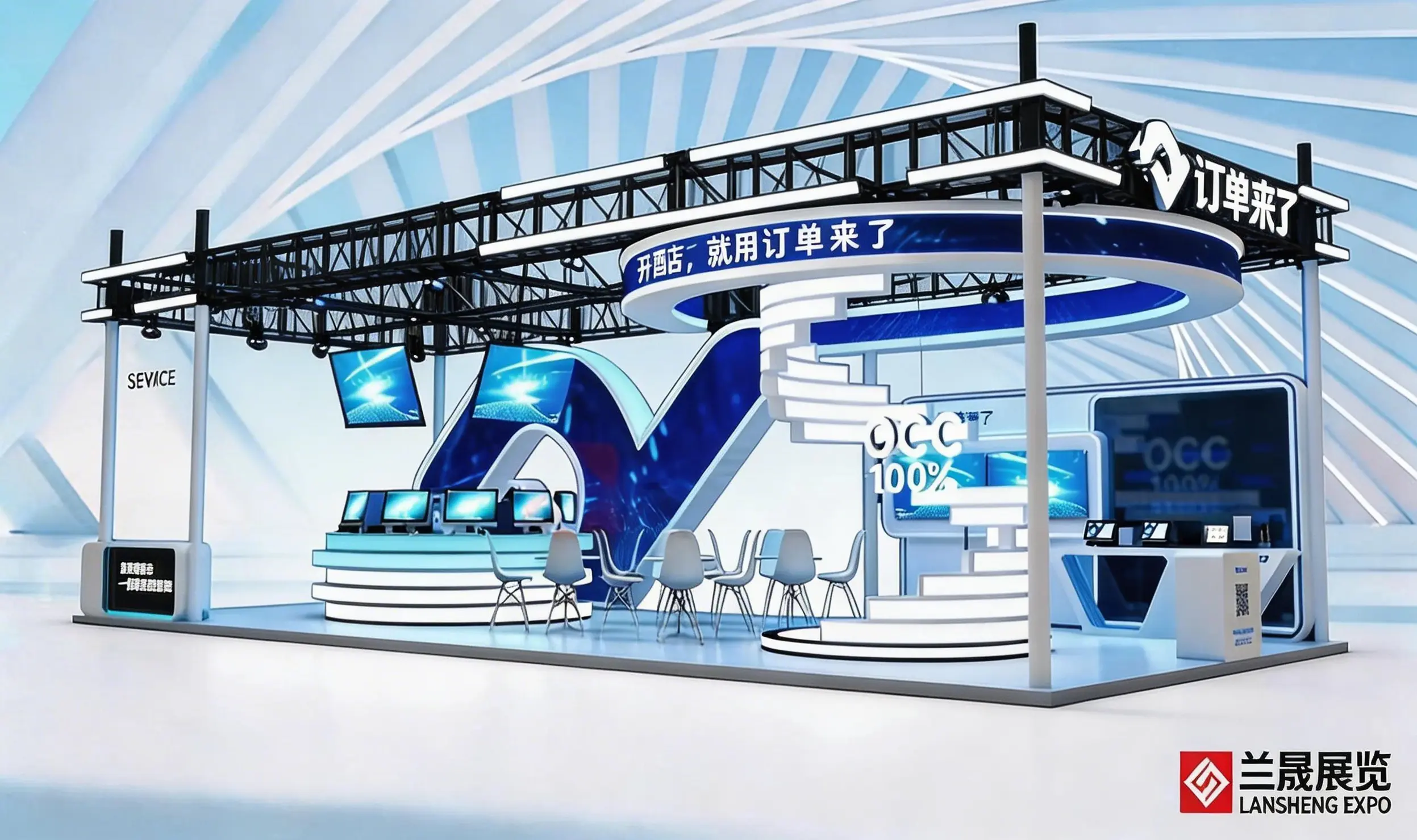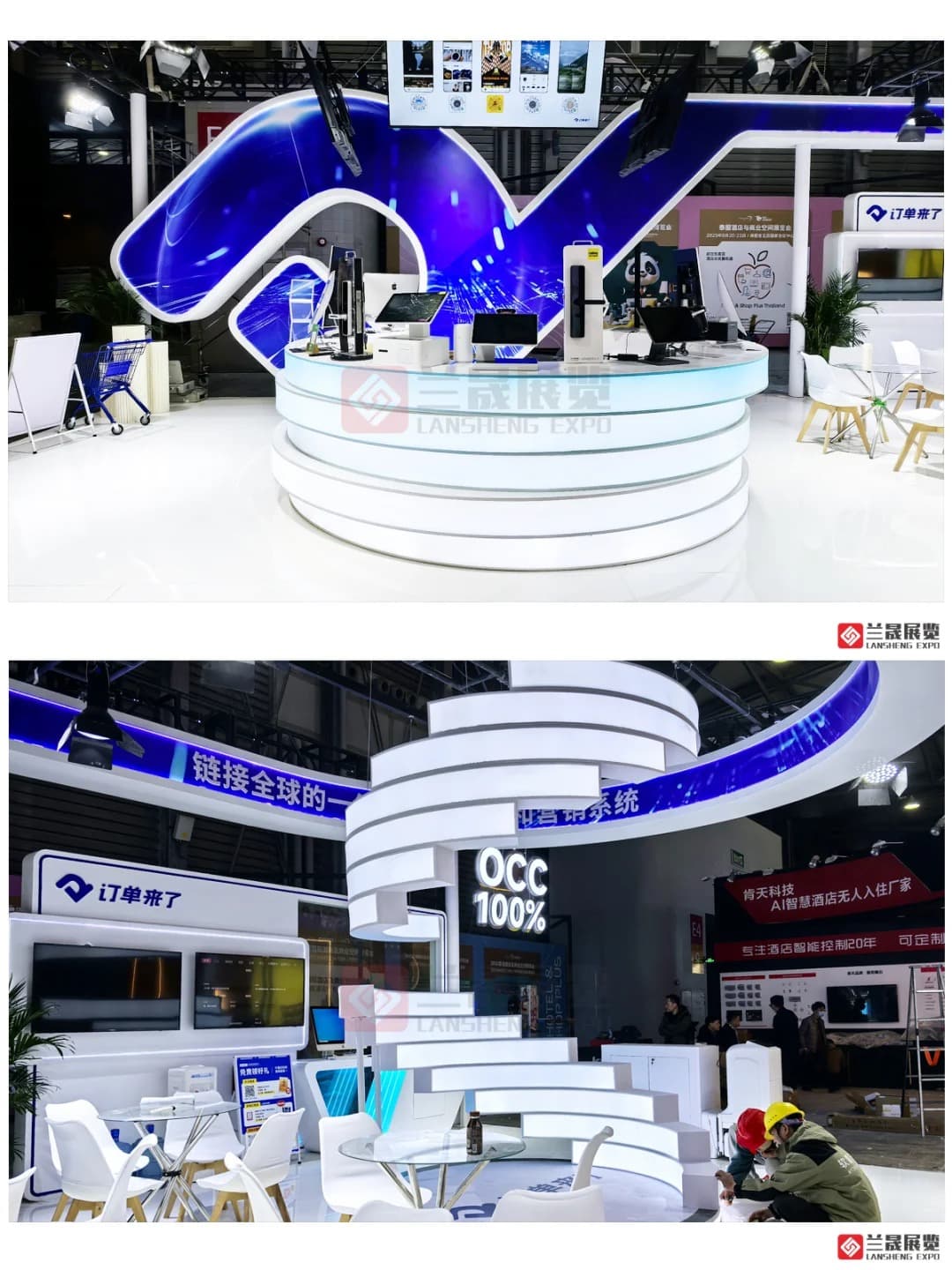 展台布局设计上,前台运用千层镜效果,造型简洁大气,整合 LOGO 品牌识别系统,借助光影交错突出品牌现代感与科技属性。演示区设于展台中央,采用圆弧错落的叠层设计,融入电脑演示区,环岛式布局提供开放的展示空间