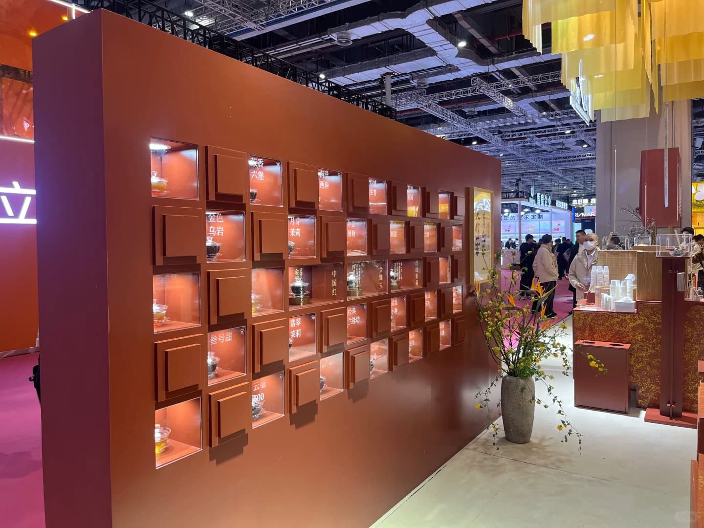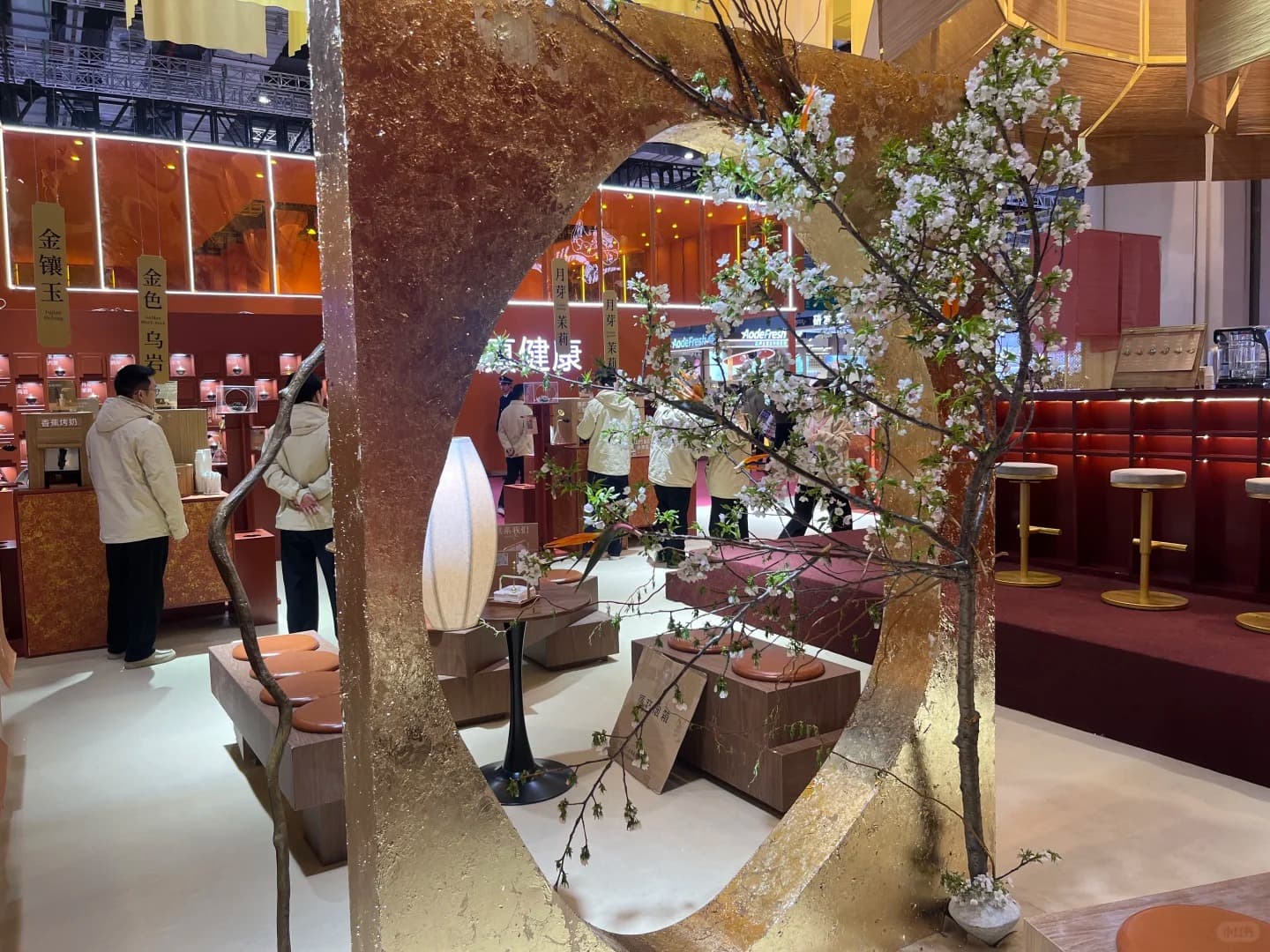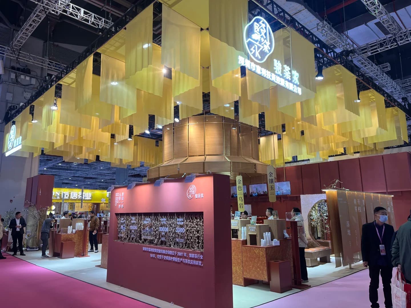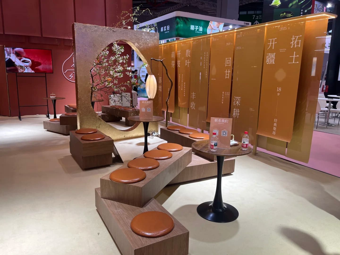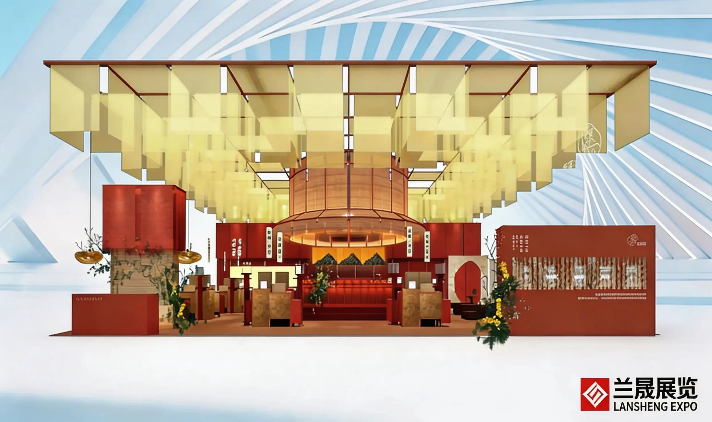 酒店用品展会展台设计搭建,该展台采用悬吊结构,悬挂的黄色半透纱增添了层次感和动感,同时柔化了空间整体氛围,营造出独特的空间展示效果