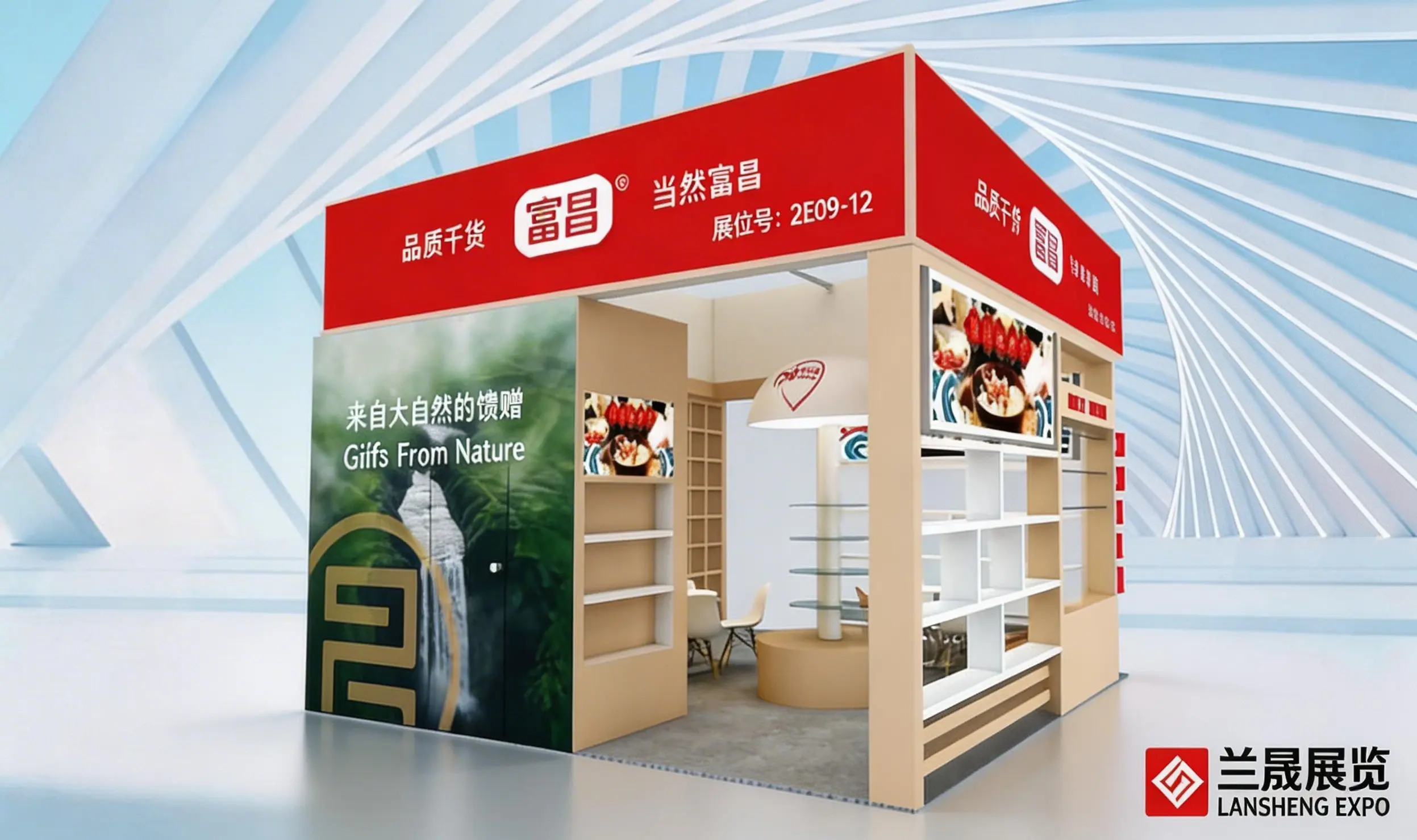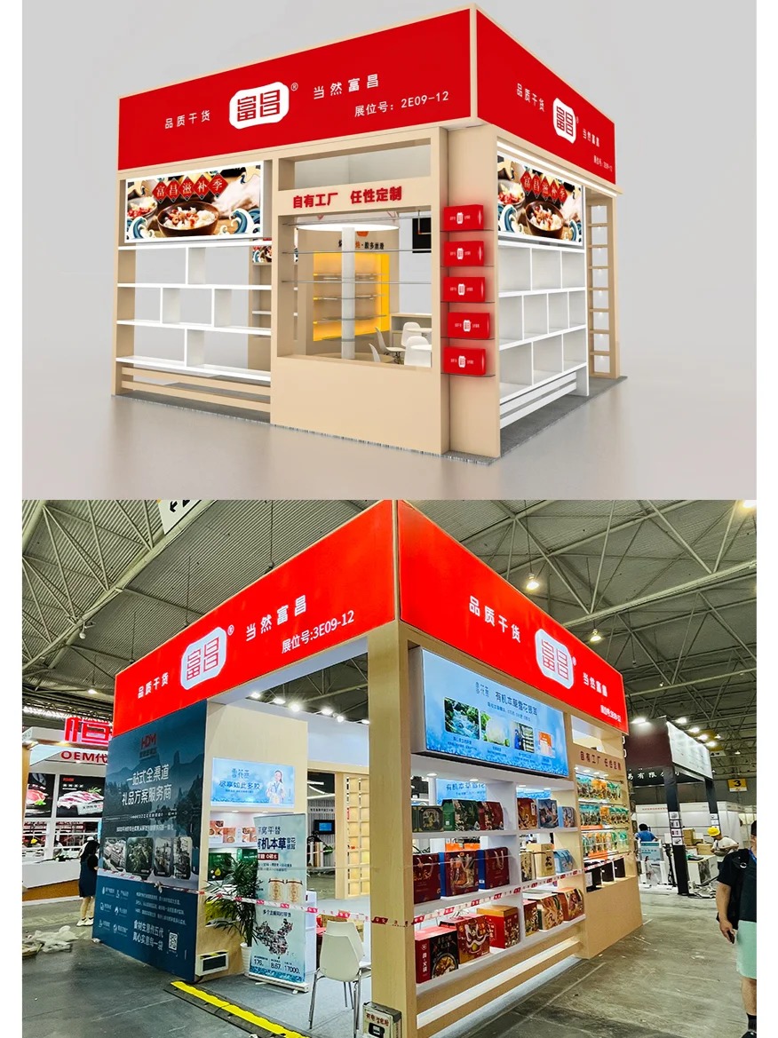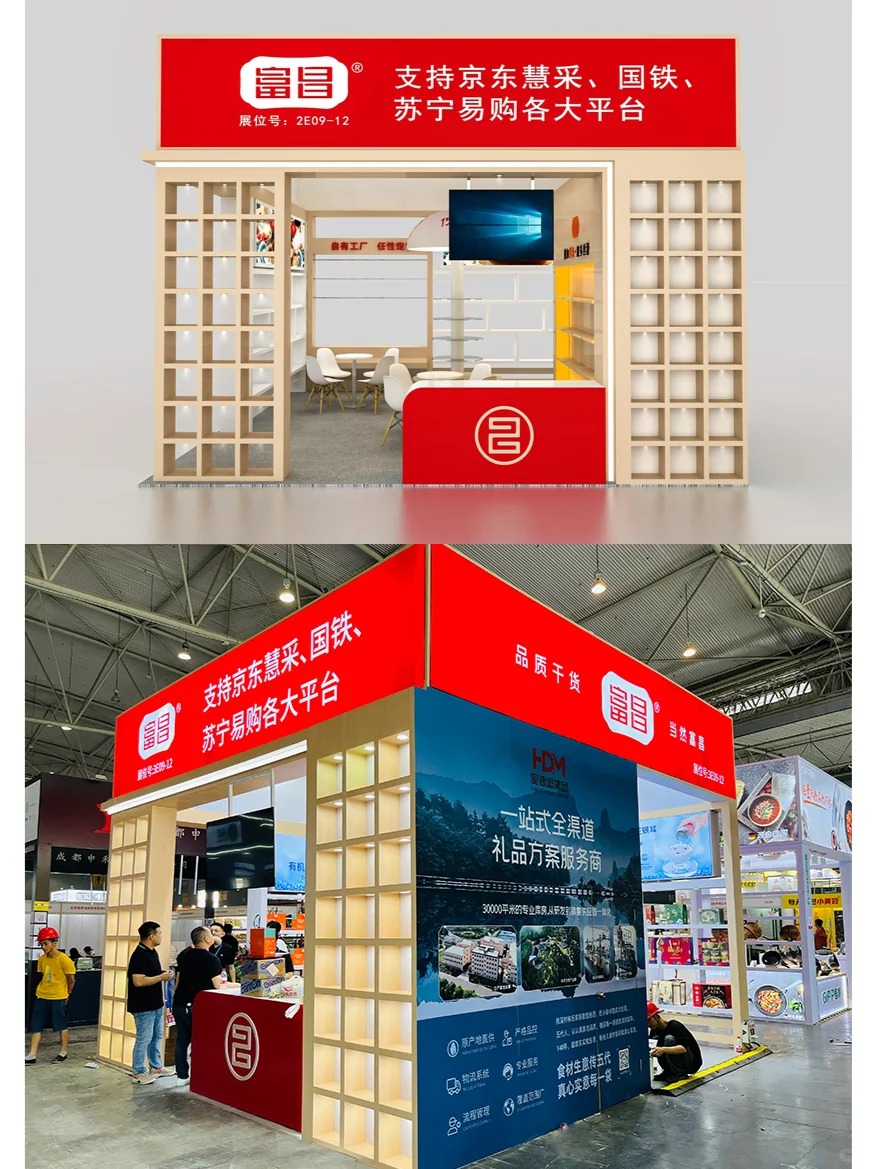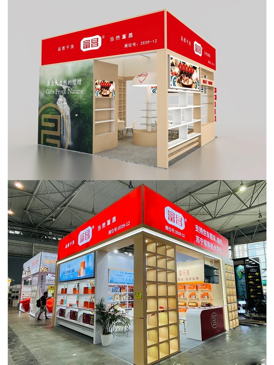 礼品展台设计搭建,该展台功能区域为接待区、洽谈区、产品展示区、品牌展示区