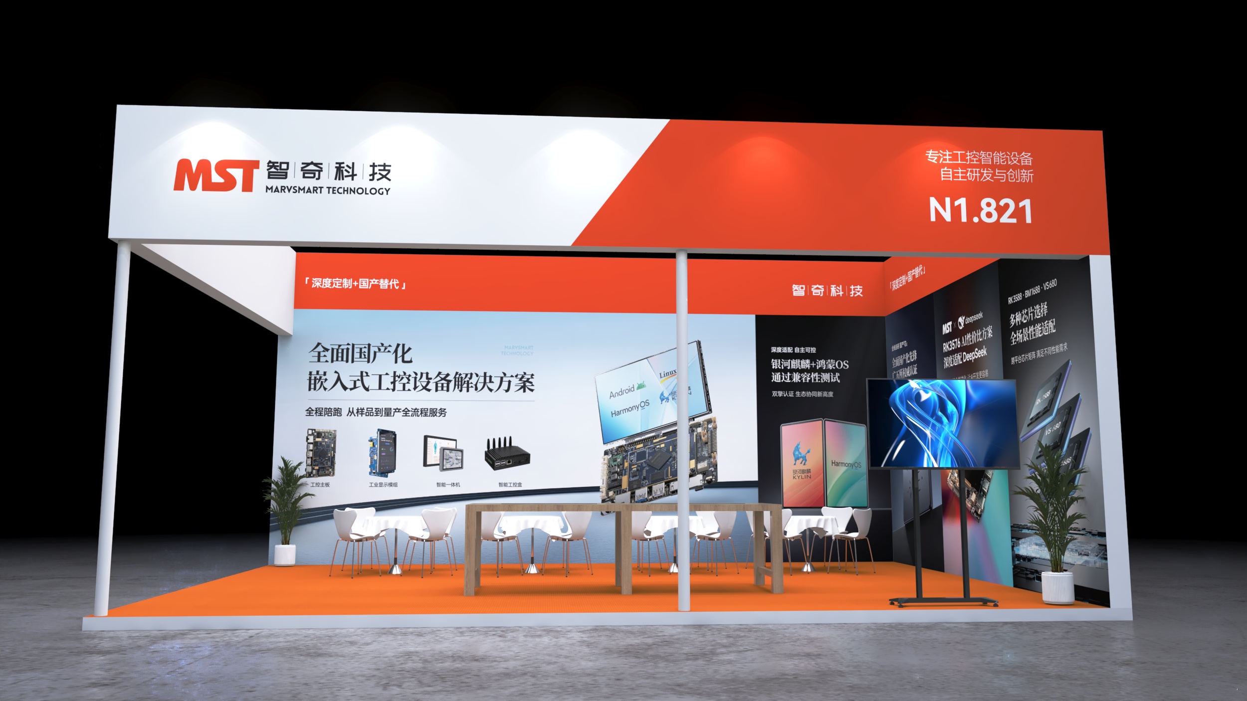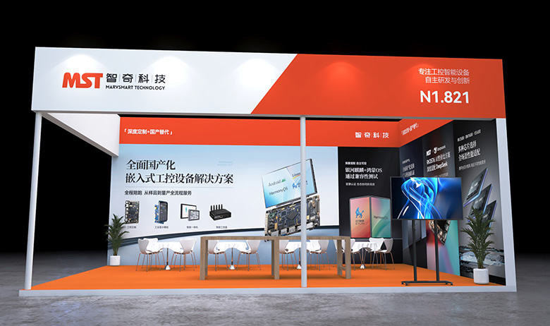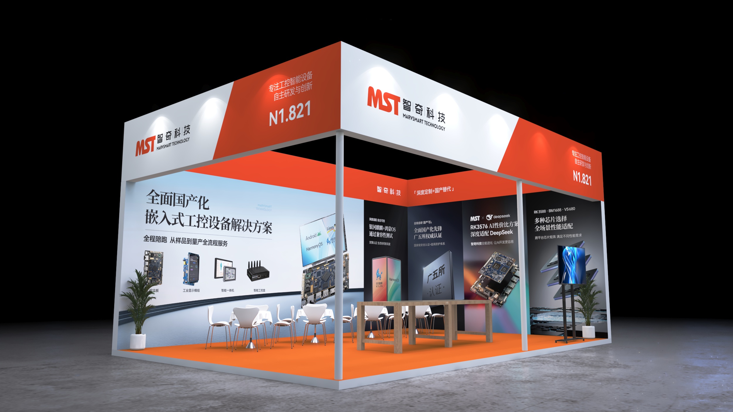 慕尼黑电子展会设计搭建,该展台功能区域包含接待区、洽谈区、产品展示区、品牌展示区