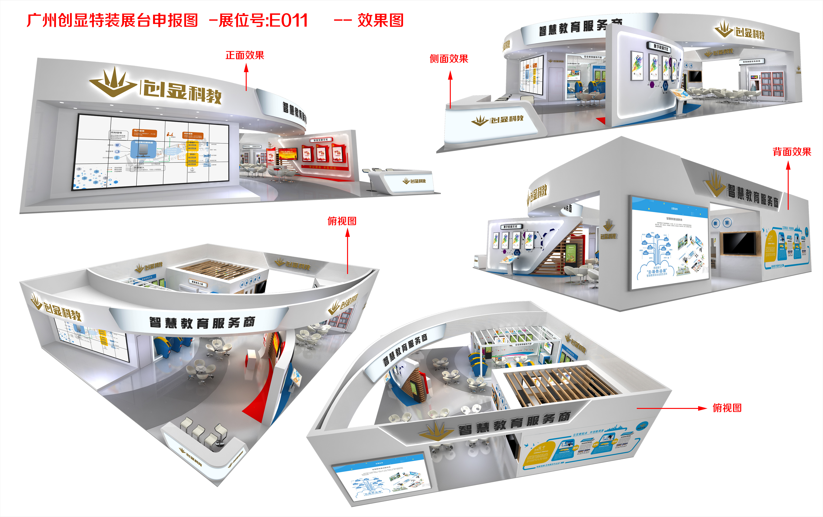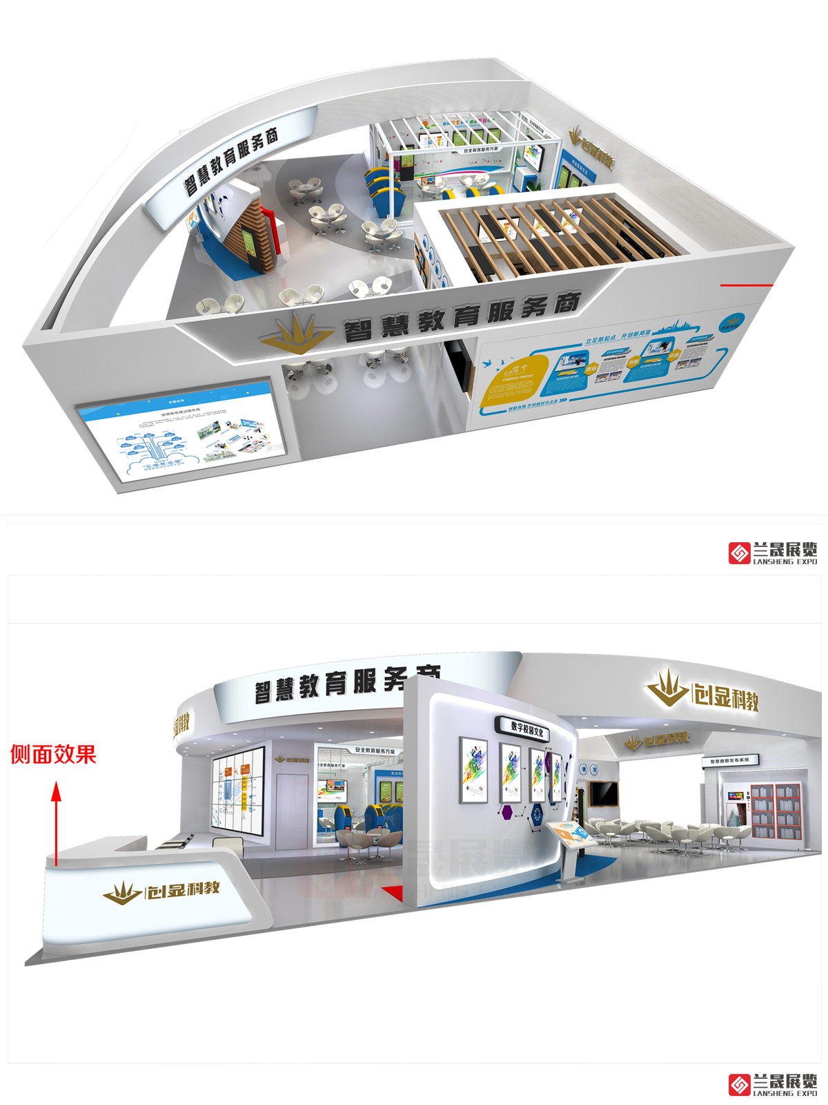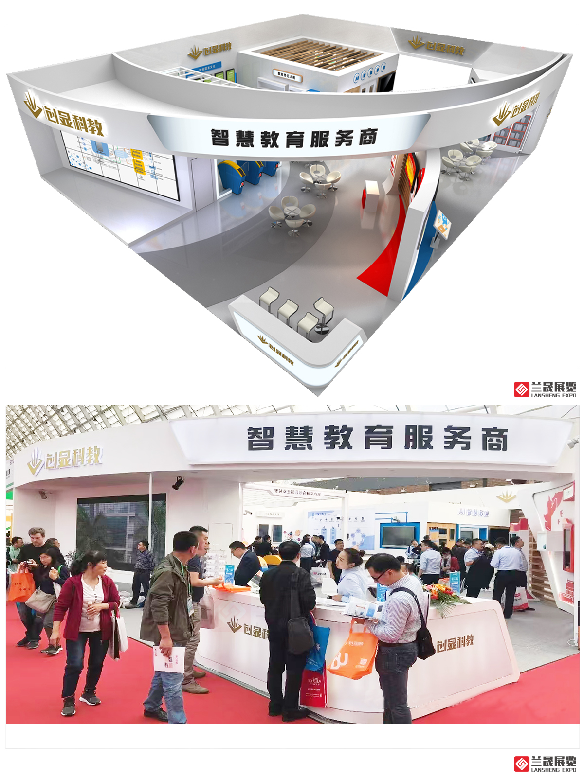 教育装备展会展台设计搭建,展台功能区域为接待区、洽谈区、产品展示区、多媒体展示区、储藏室、模拟教室