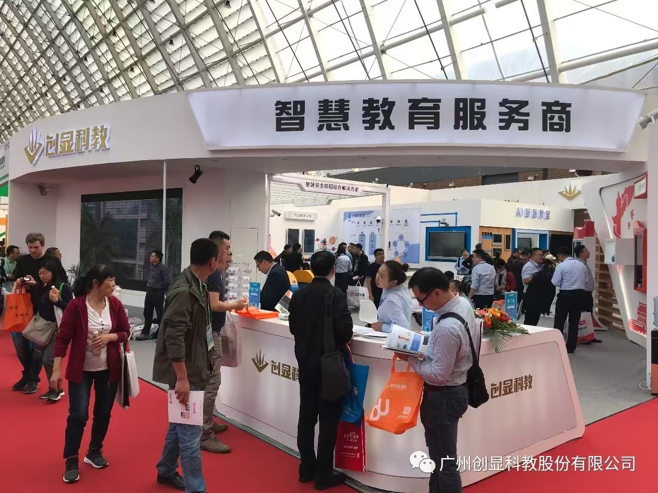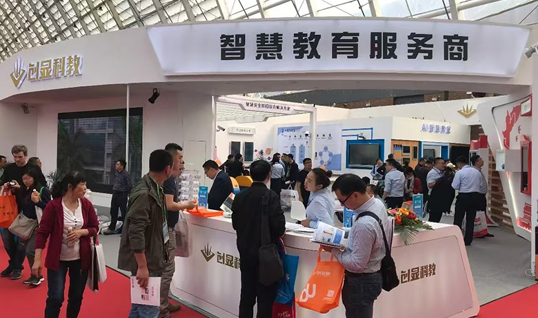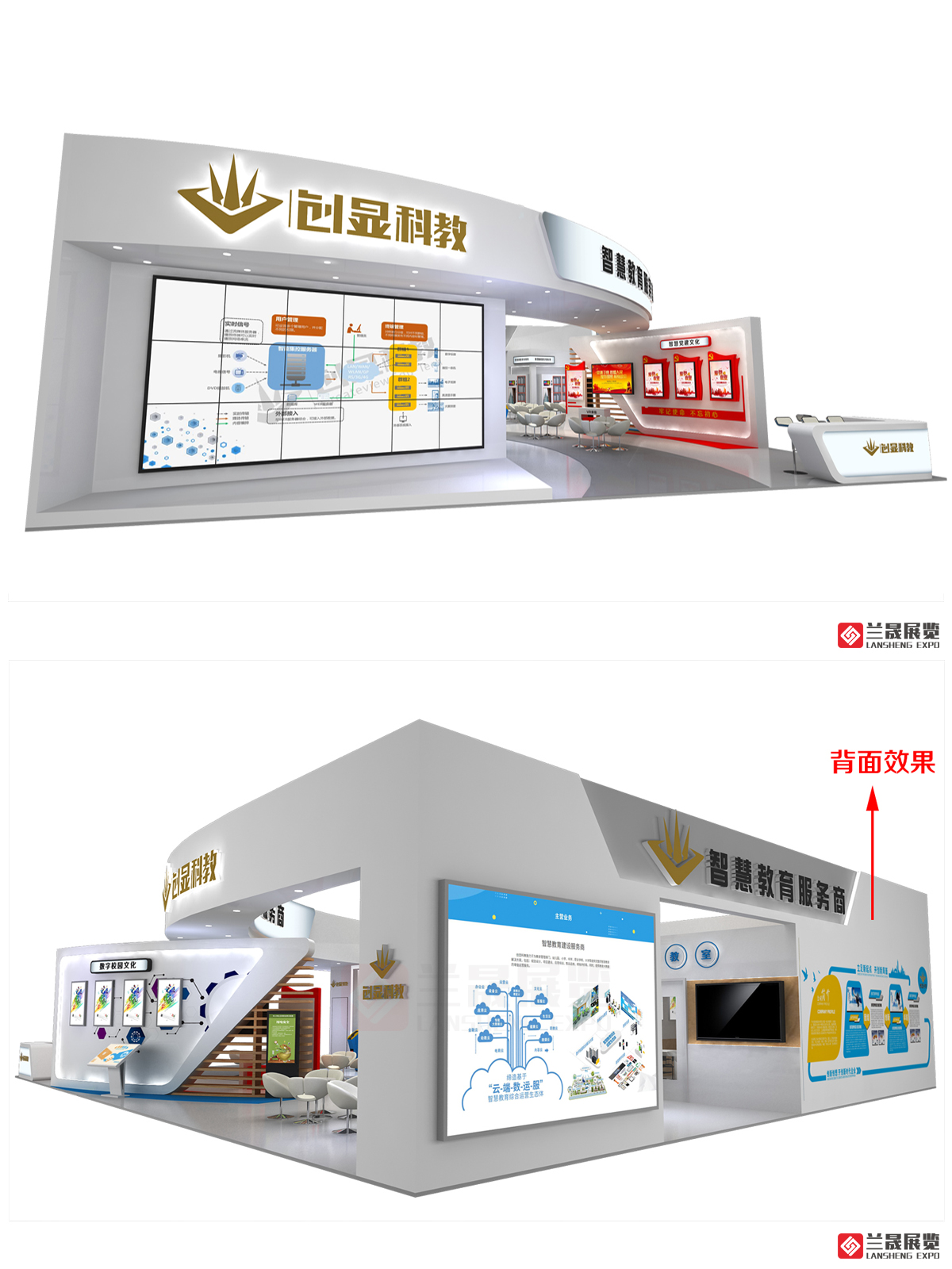 教育装备展会展台设计搭建,展台功能区域为接待区、洽谈区、产品展示区、多媒体展示区、储藏室、模拟教室