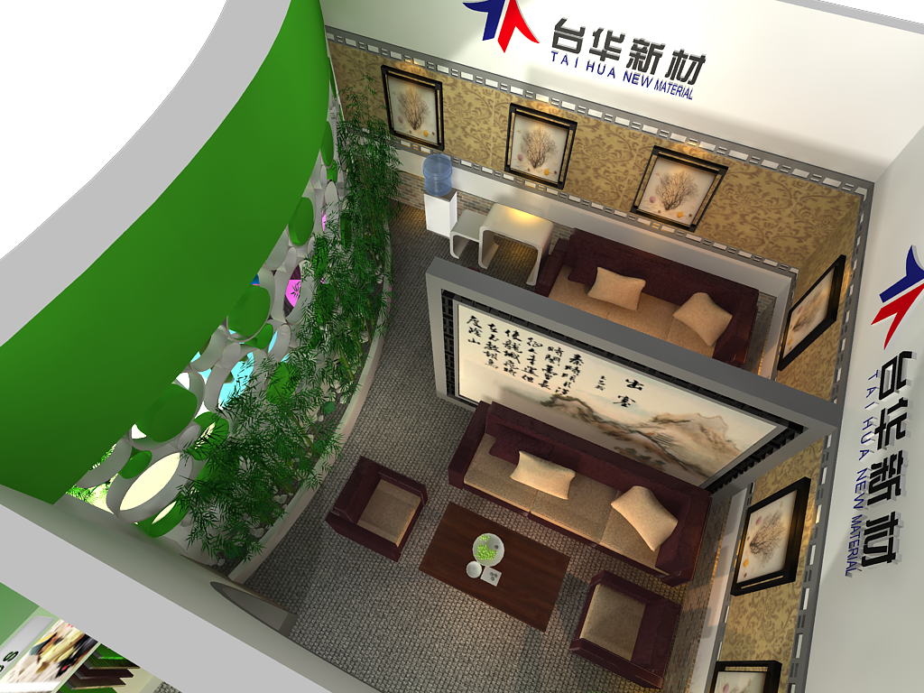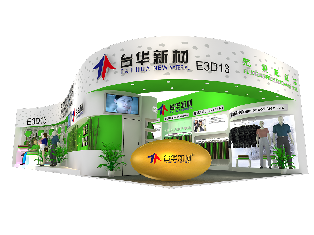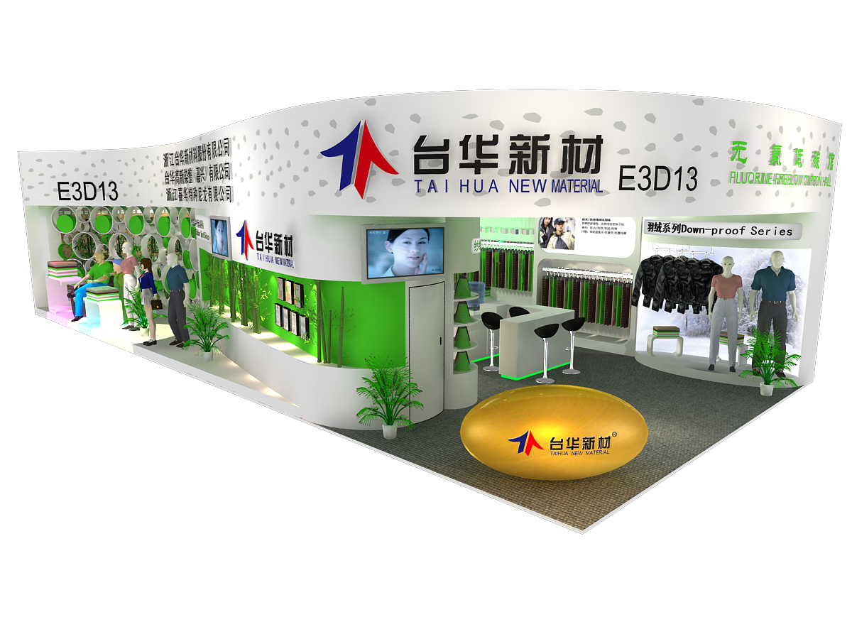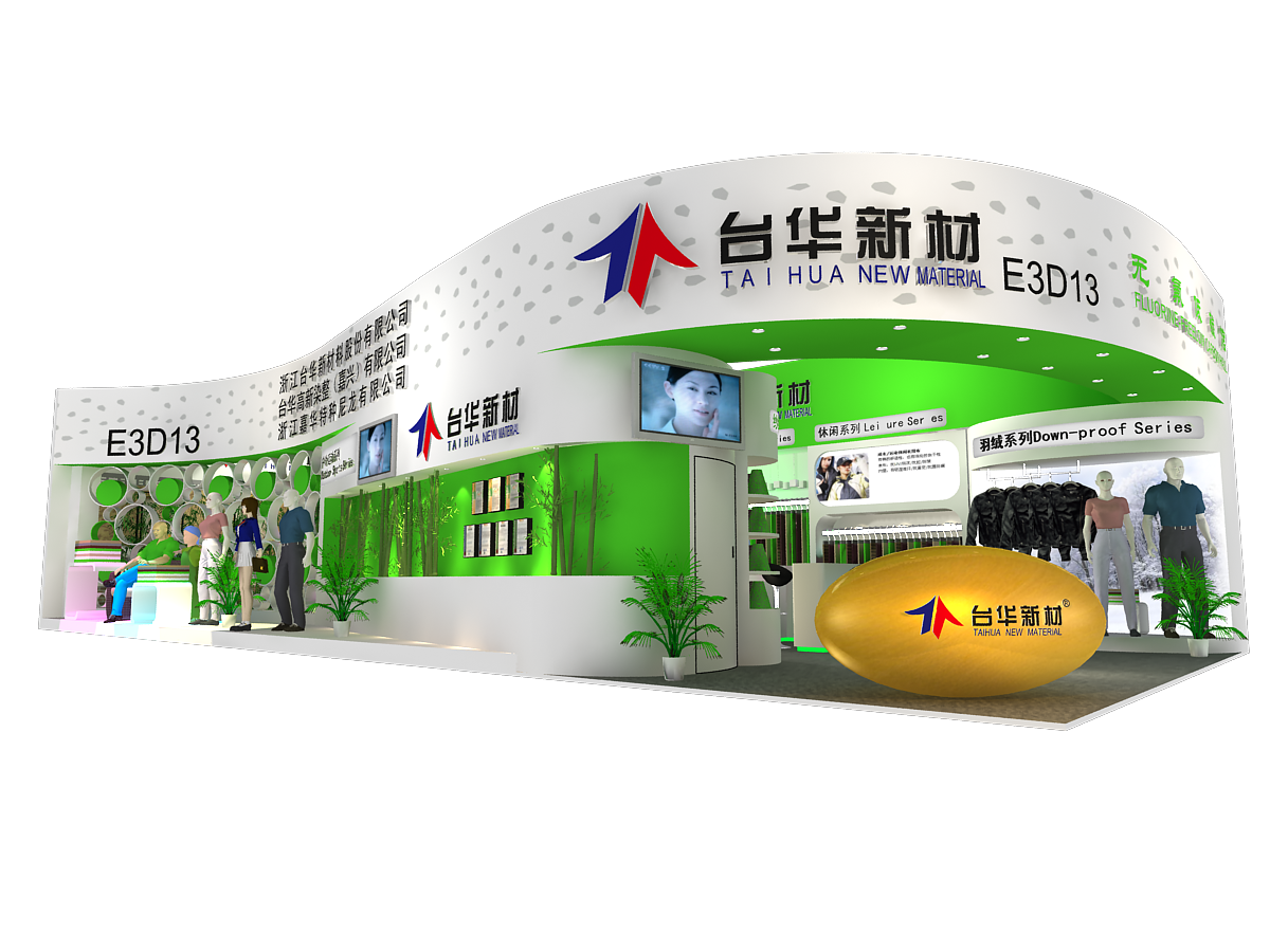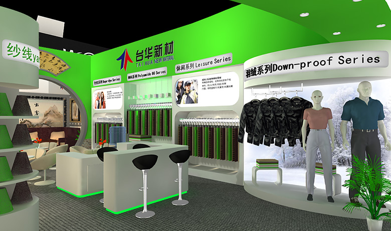 纺织面料展会展台设计搭建,展台配备接待区、洽谈区、产品展示区、多媒体展示区、储藏室、会客室