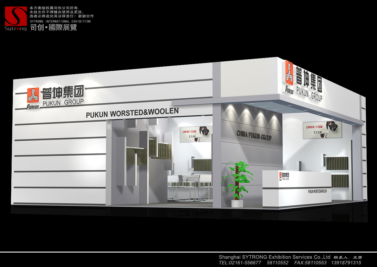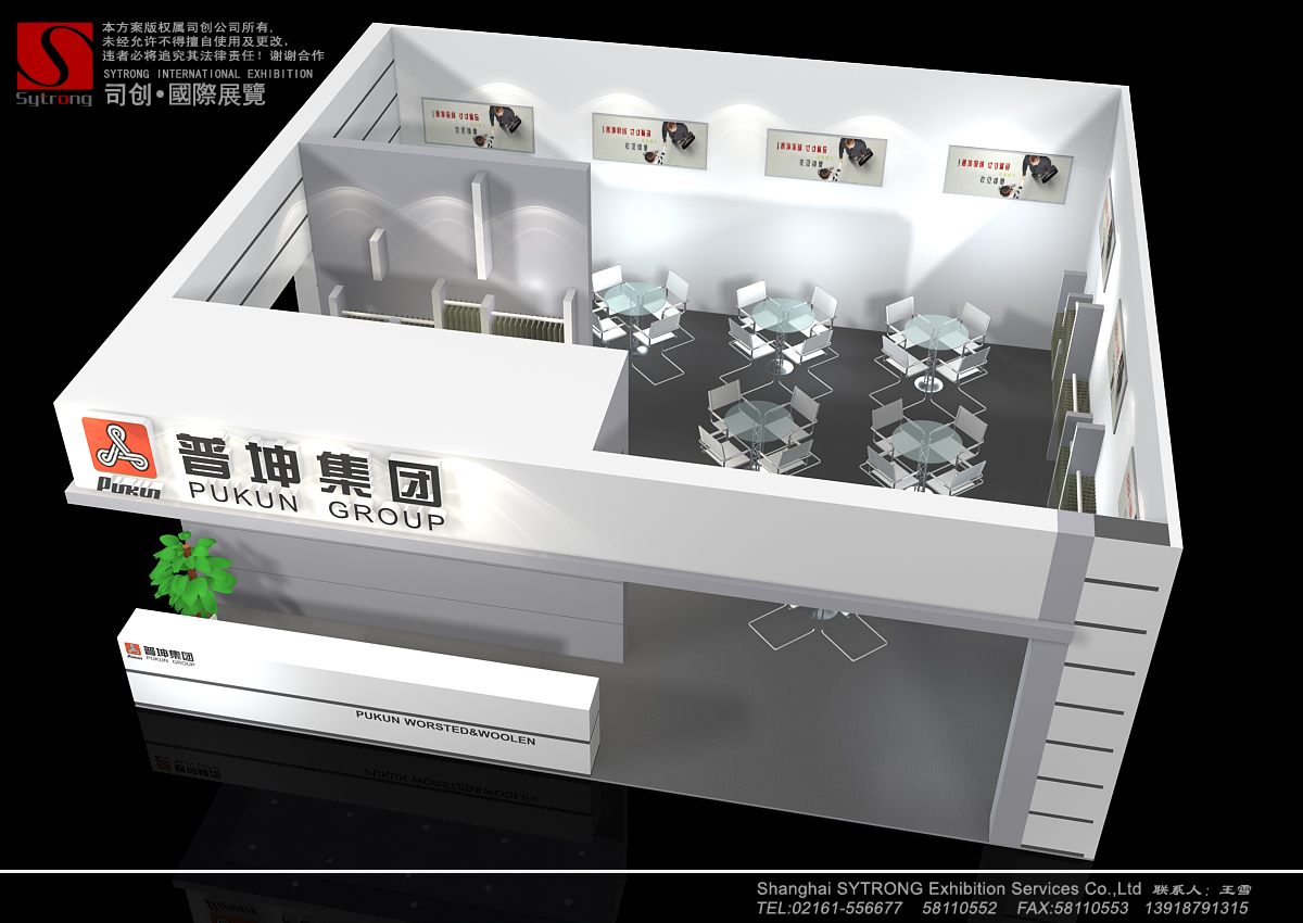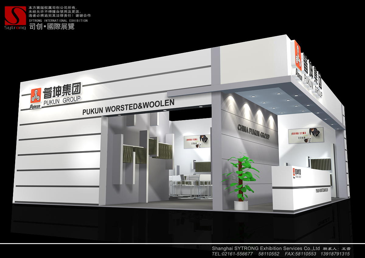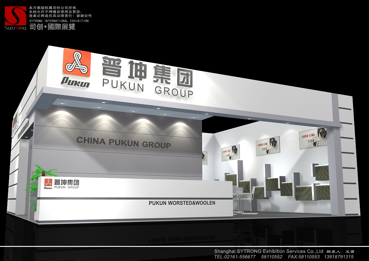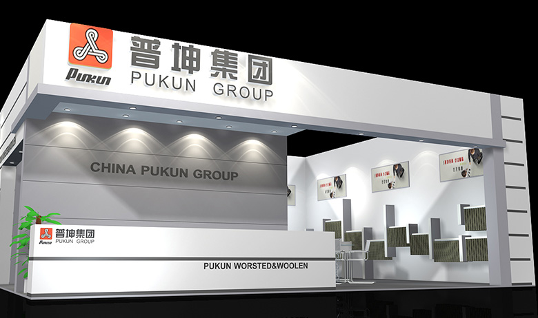 纺织面料展会设计搭建,展台配备接待区、洽谈区、产品展示区、储藏室