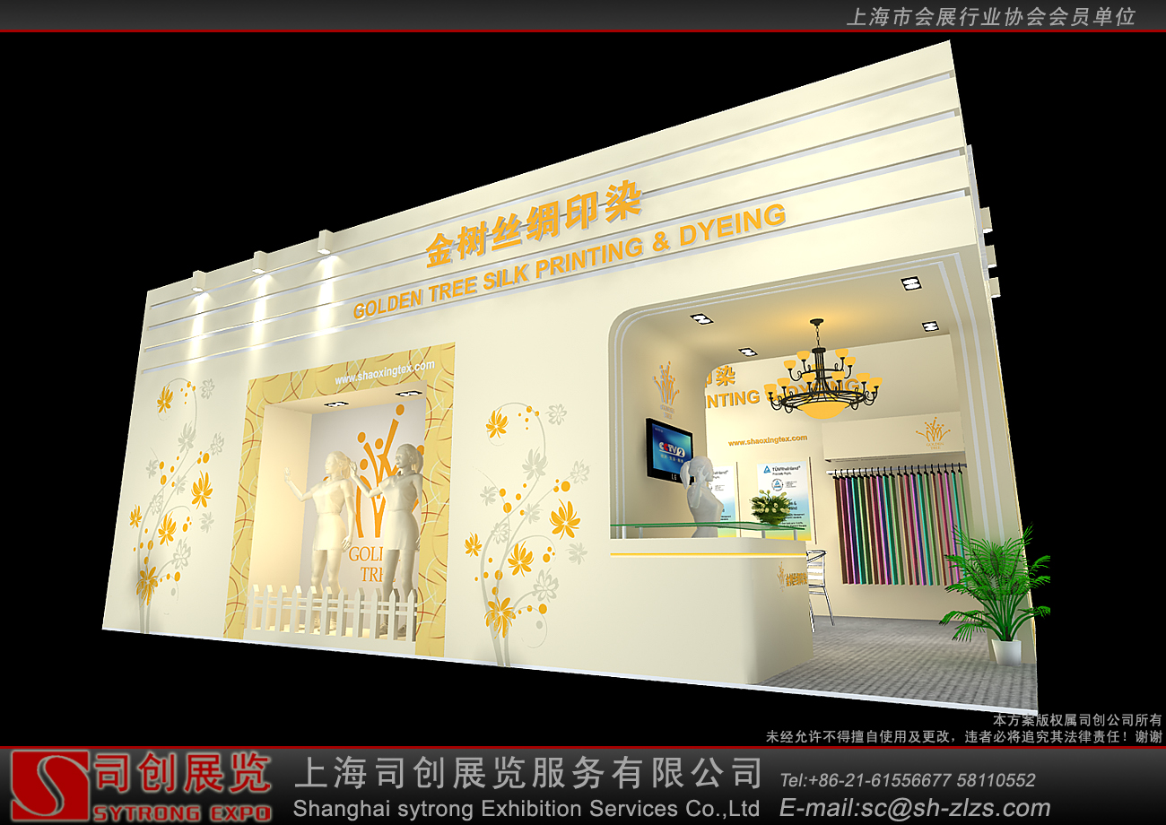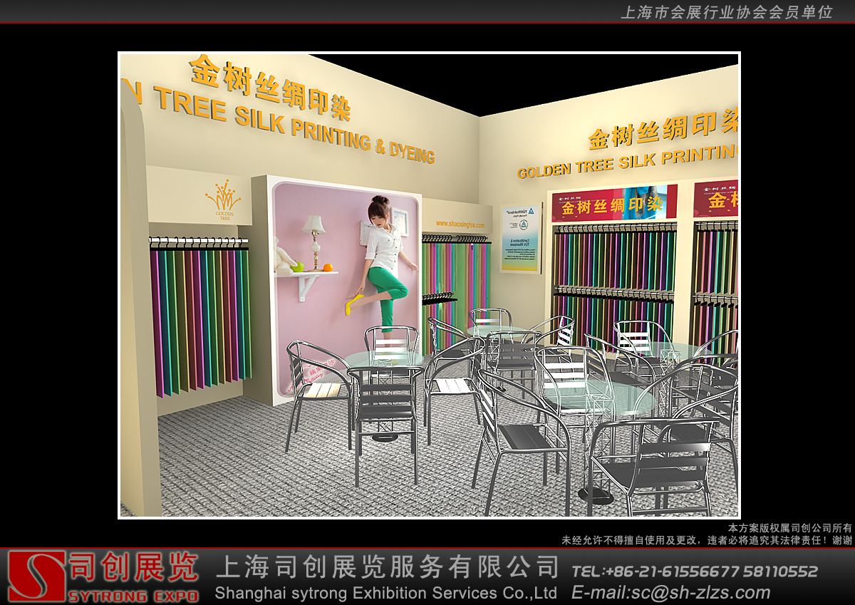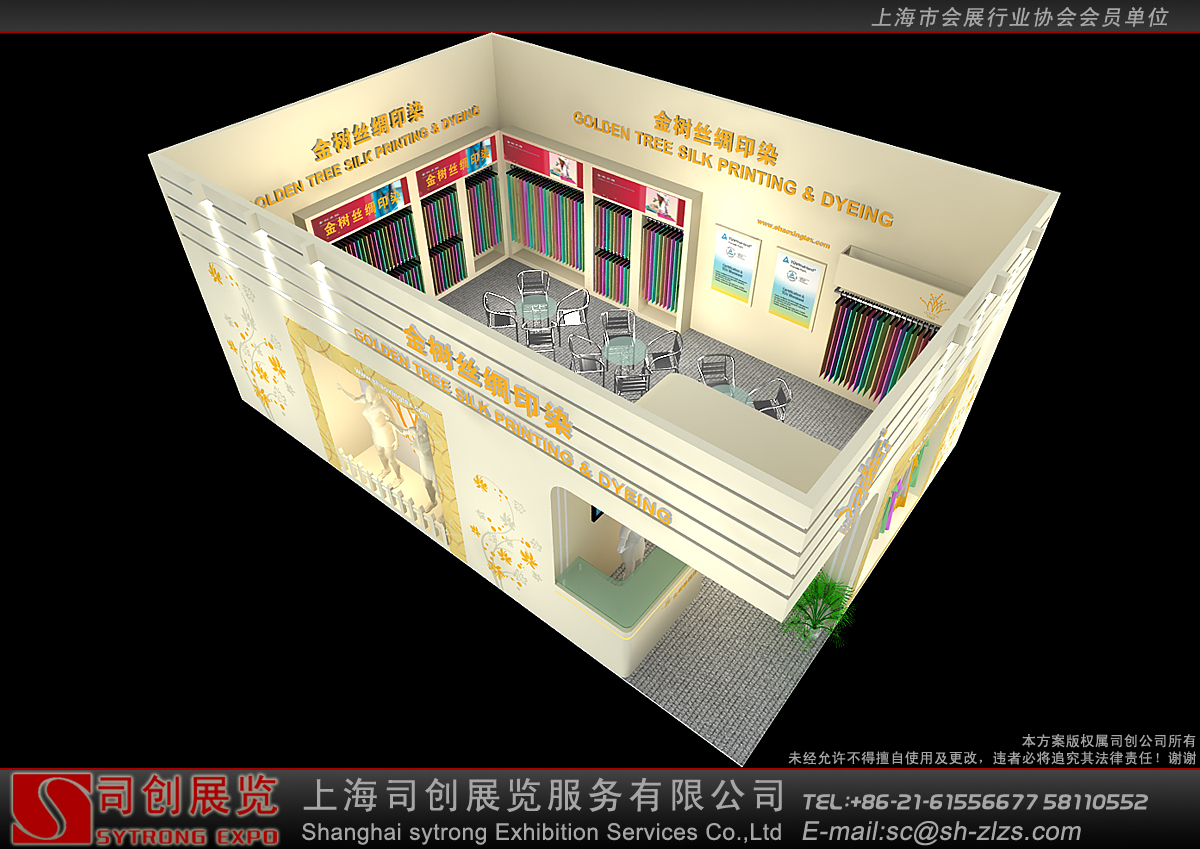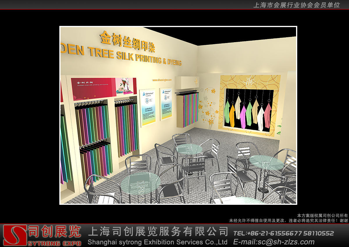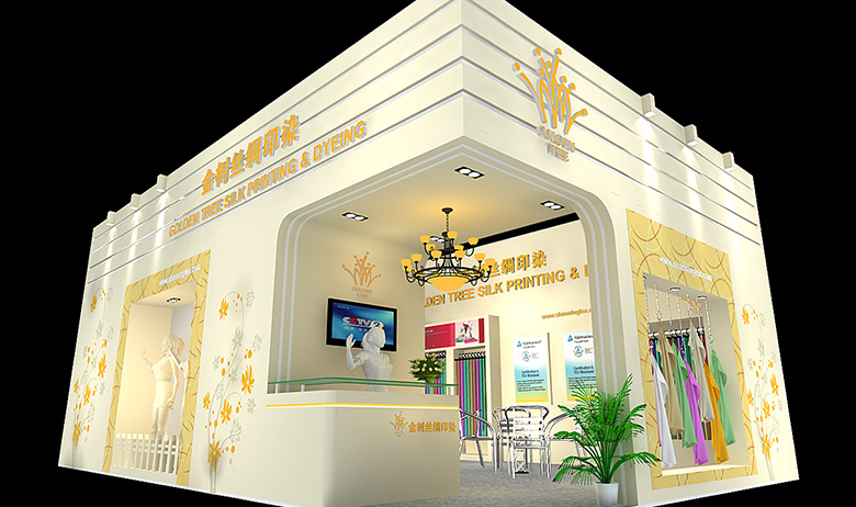 纺织面料展会设计搭建,展台配备接待区、洽谈区、产品展示区、储藏室