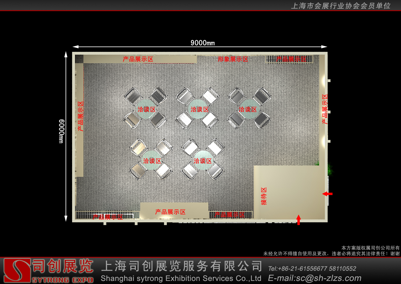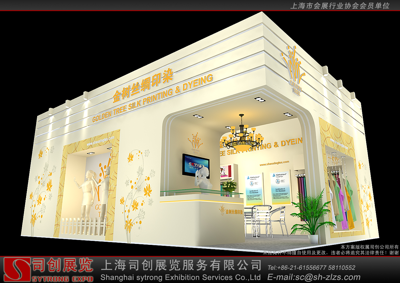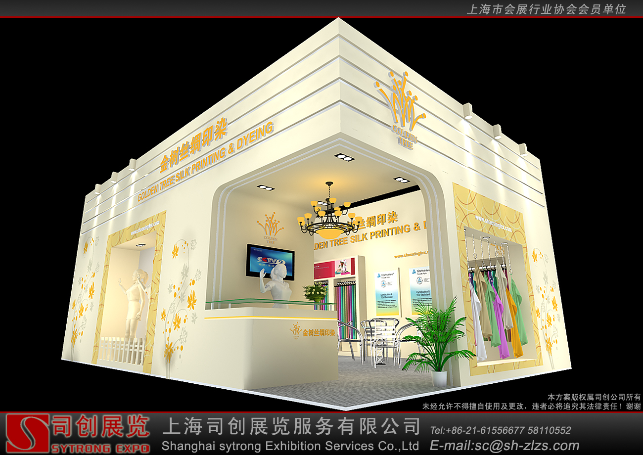 纺织面料展会设计搭建,展台配备接待区、洽谈区、产品展示区、储藏室