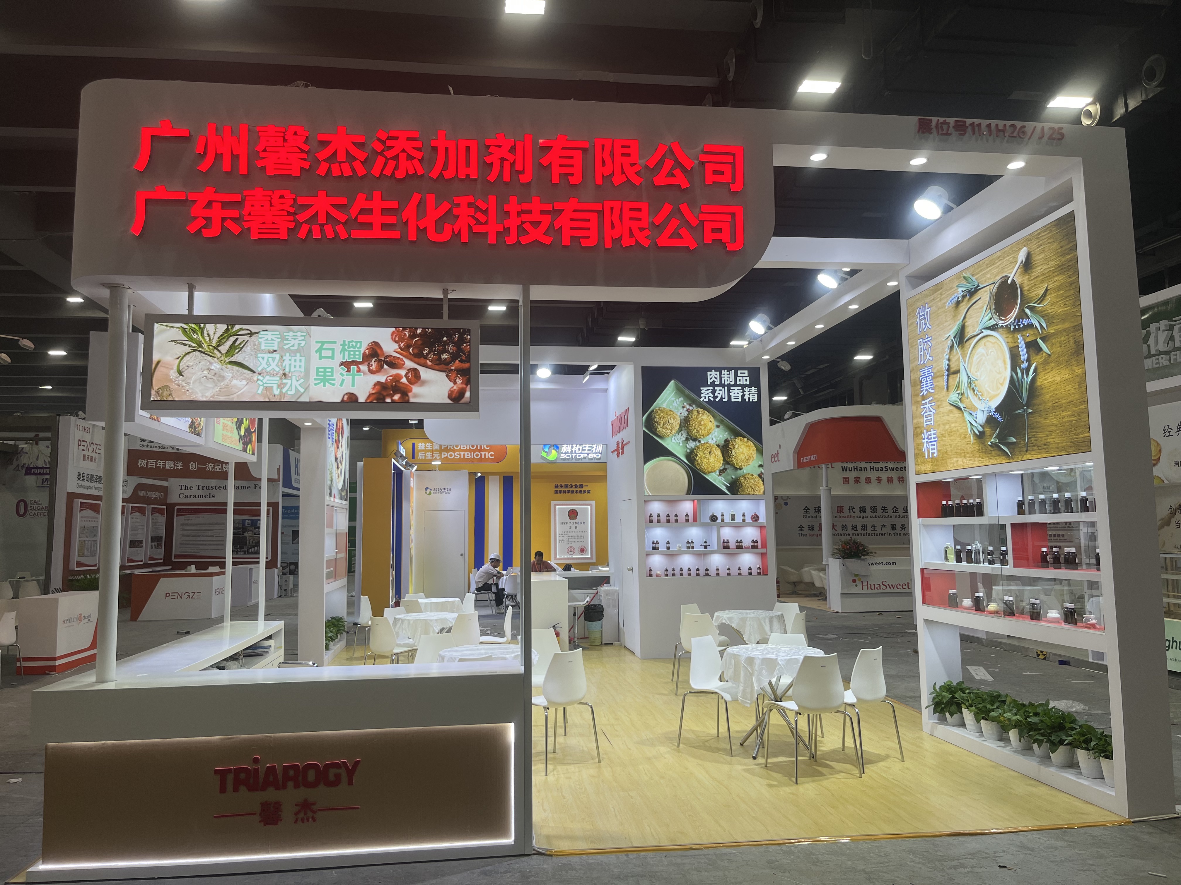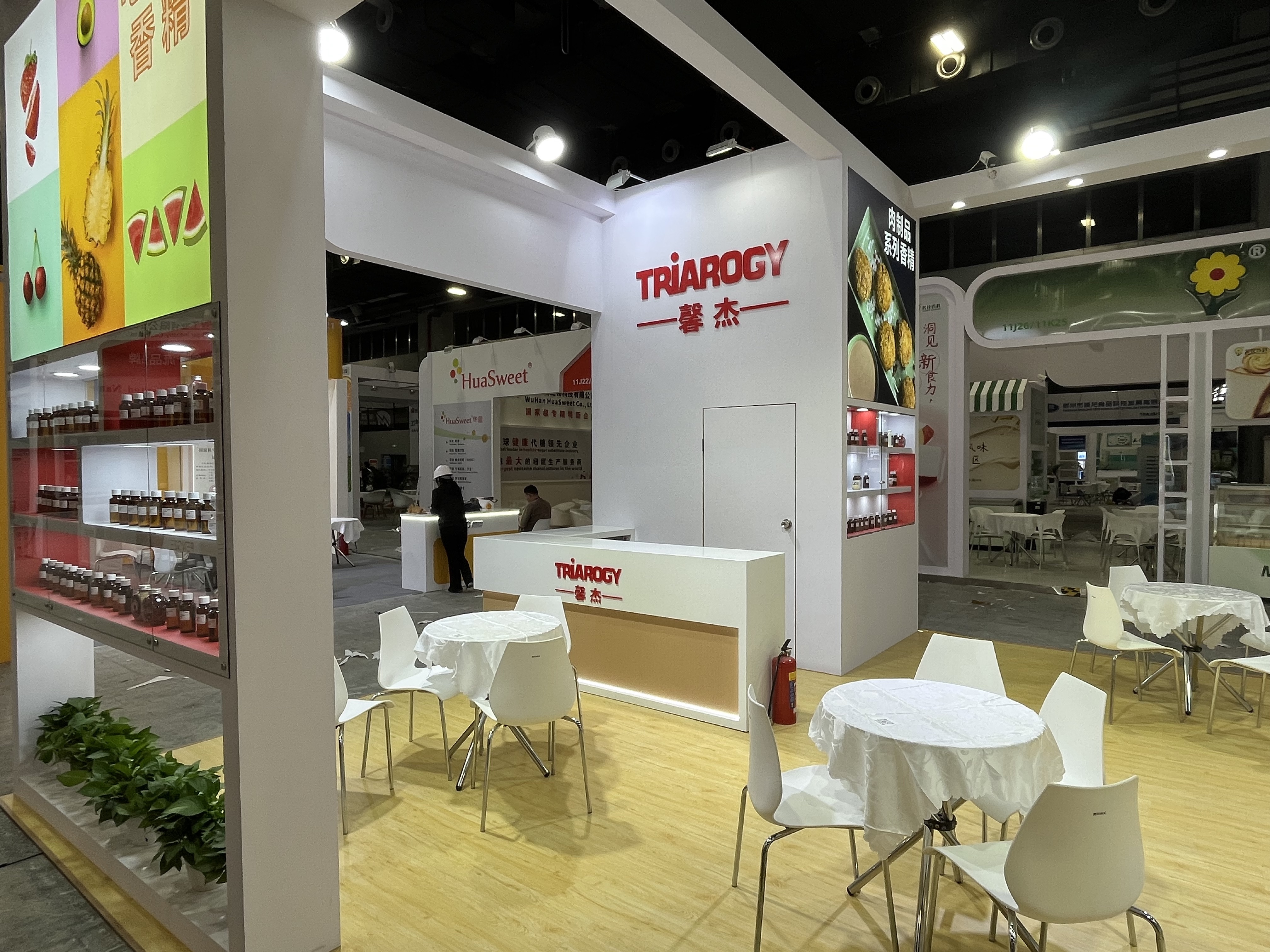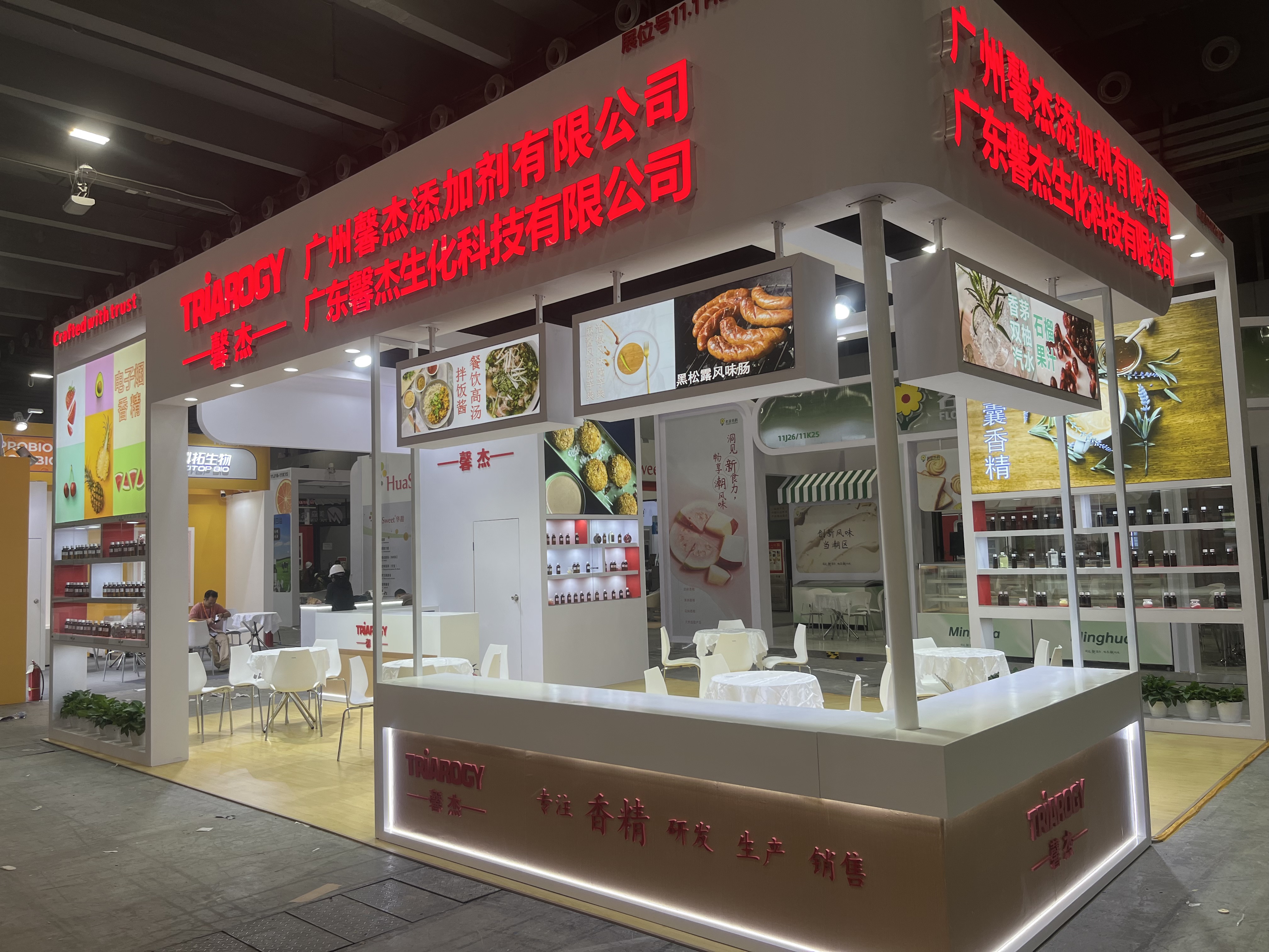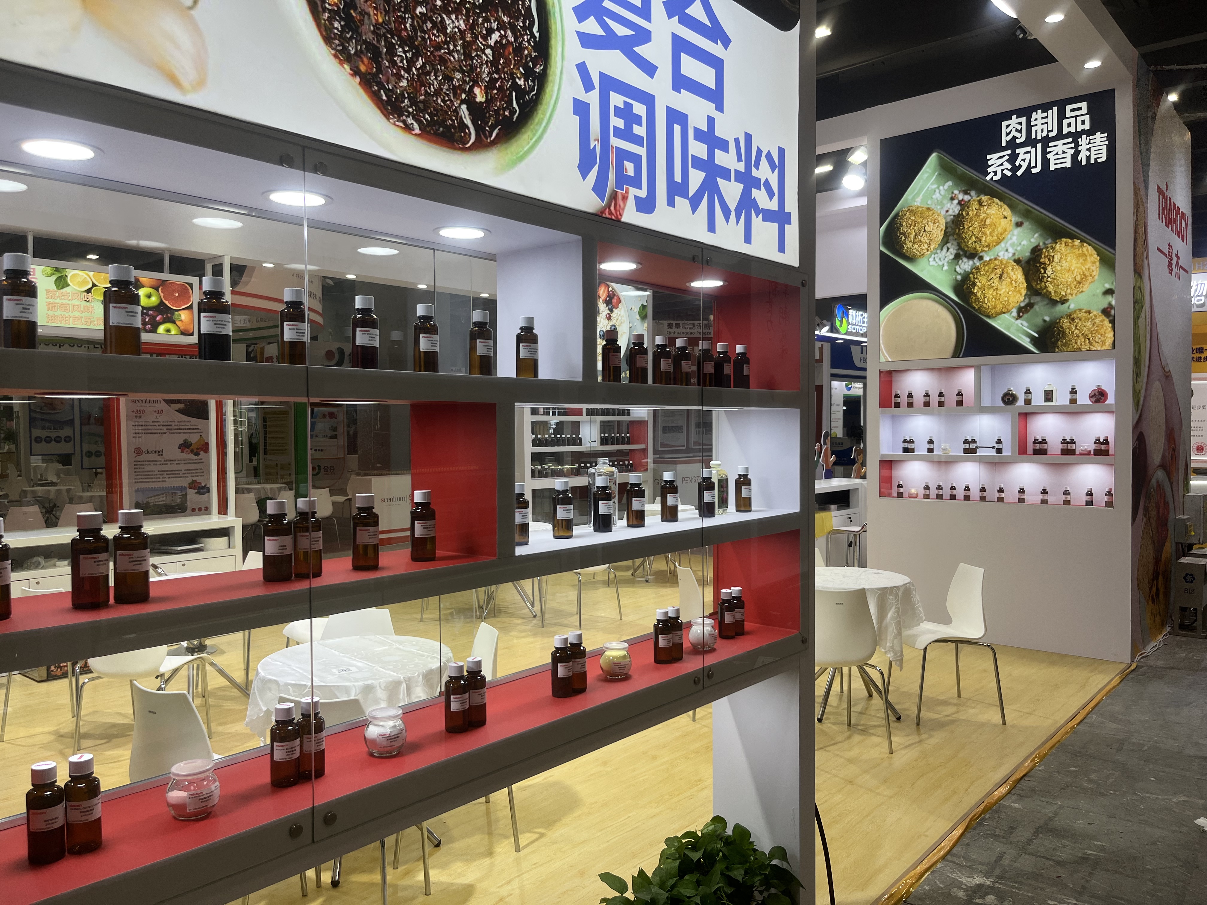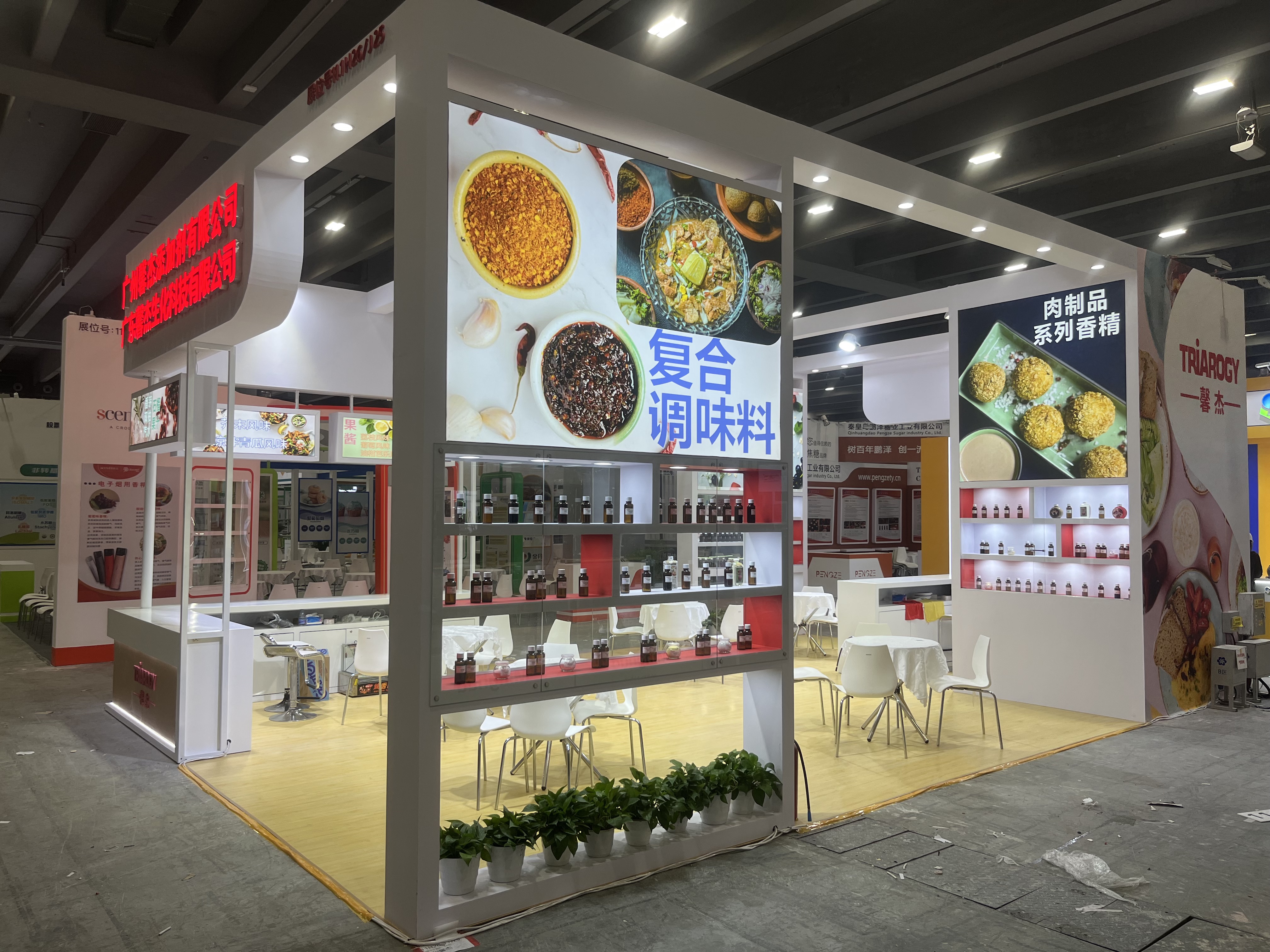 食品展会展台设计搭建,该展台配备接待区、洽谈区、存储区、产品展示区、品牌展示区
