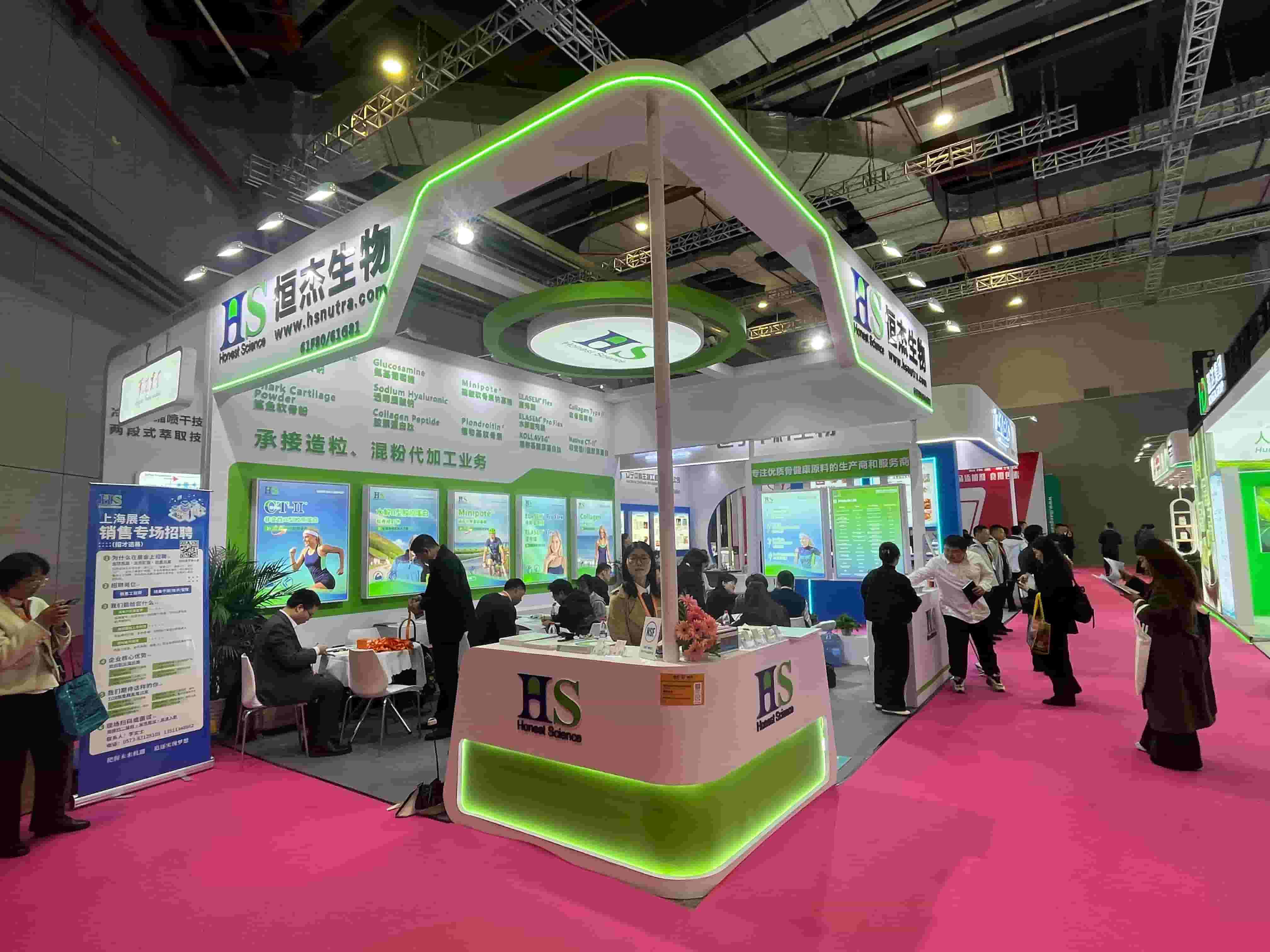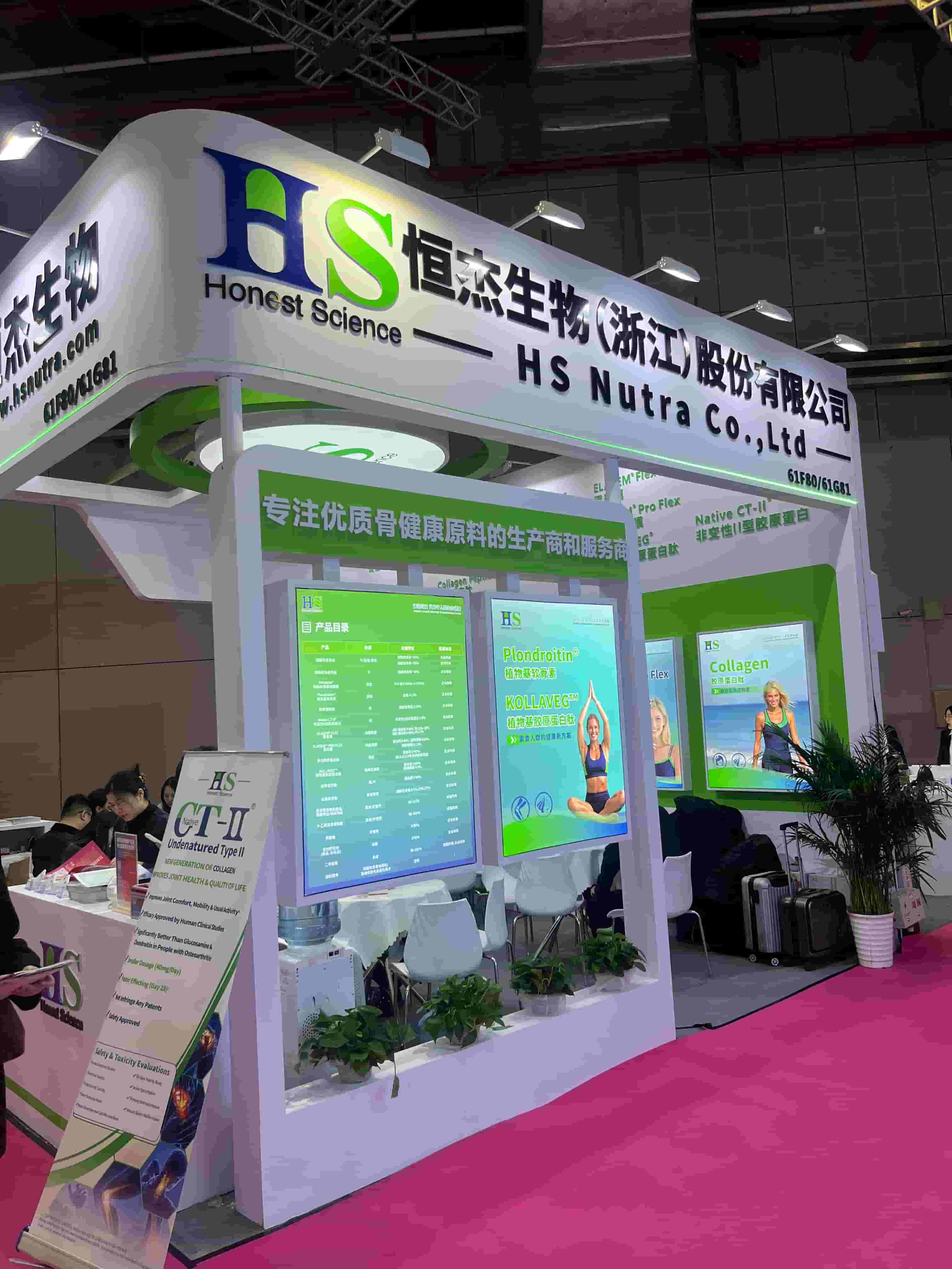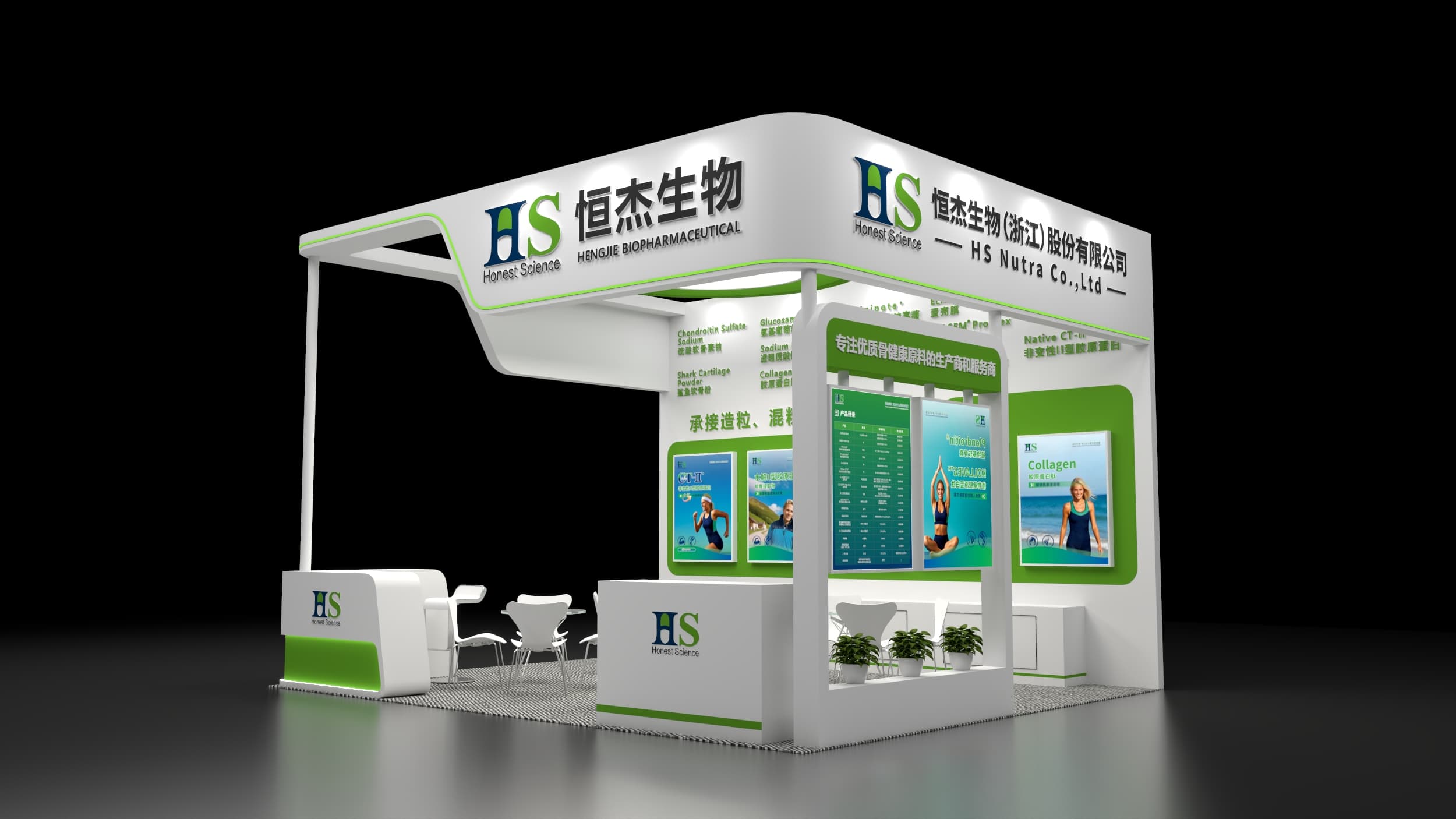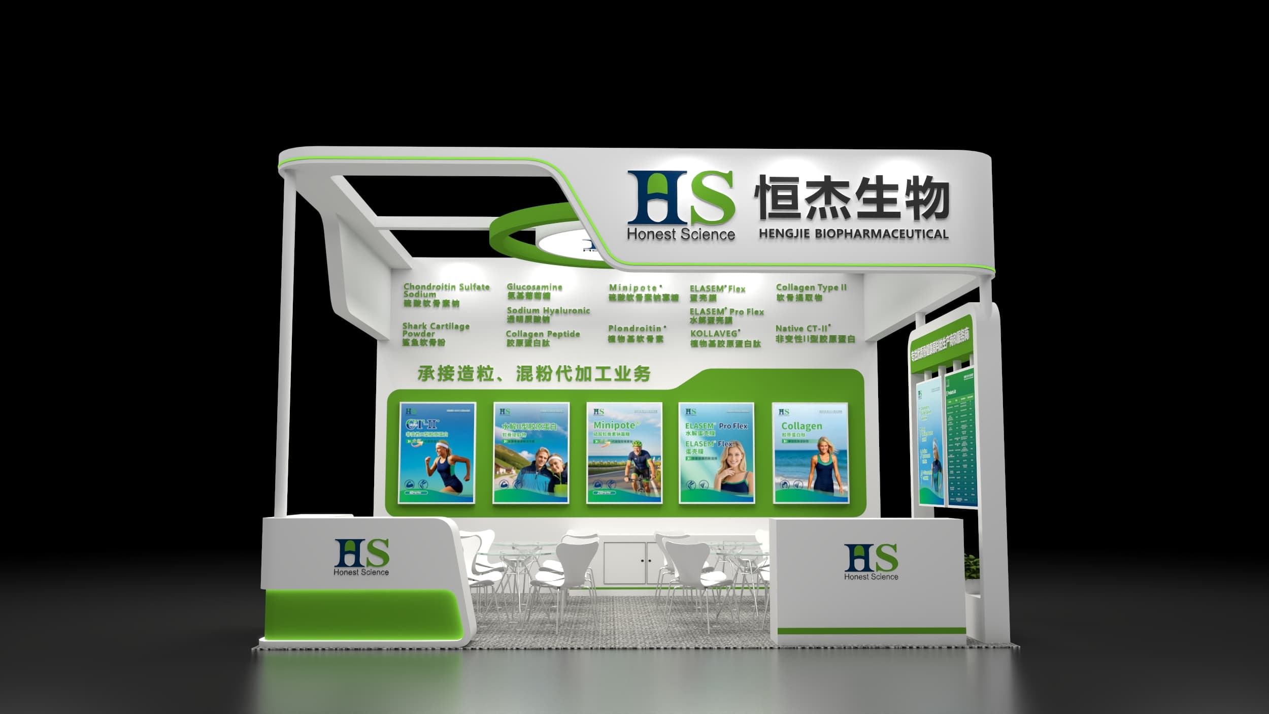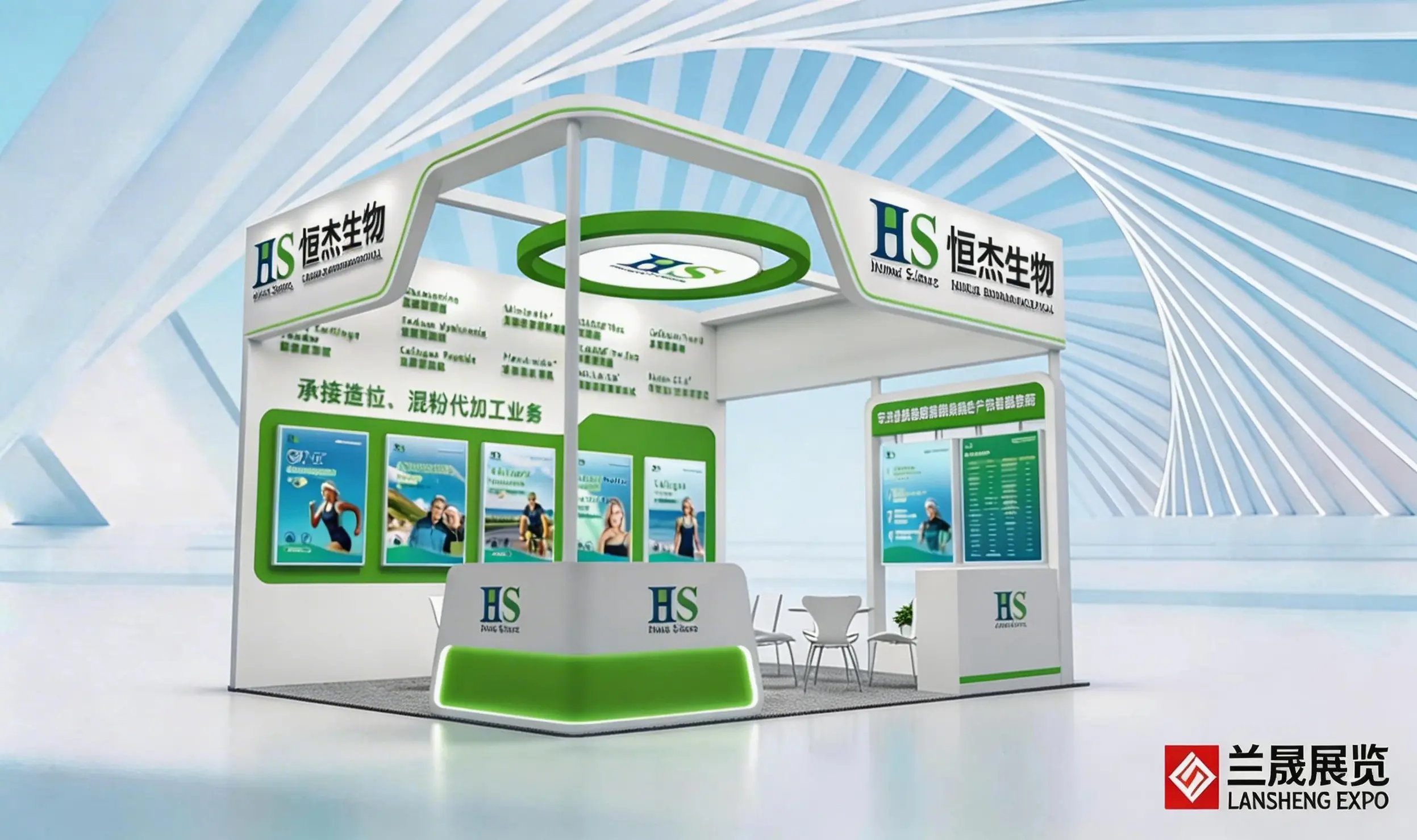 FIC食品添加剂展会设计搭建,展台功能区包含接待区、洽谈区、品牌展示区