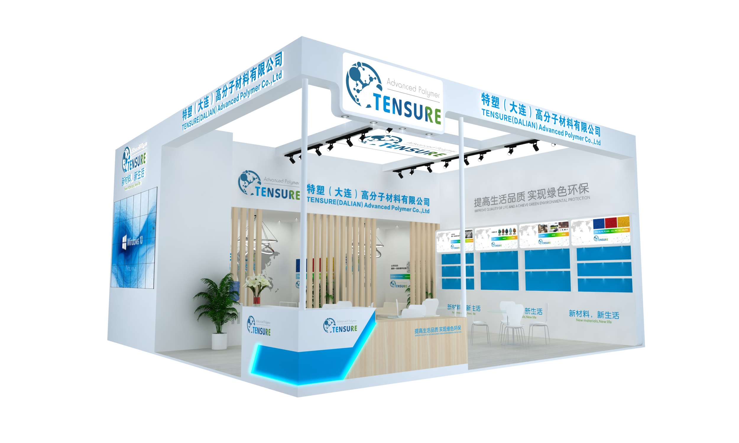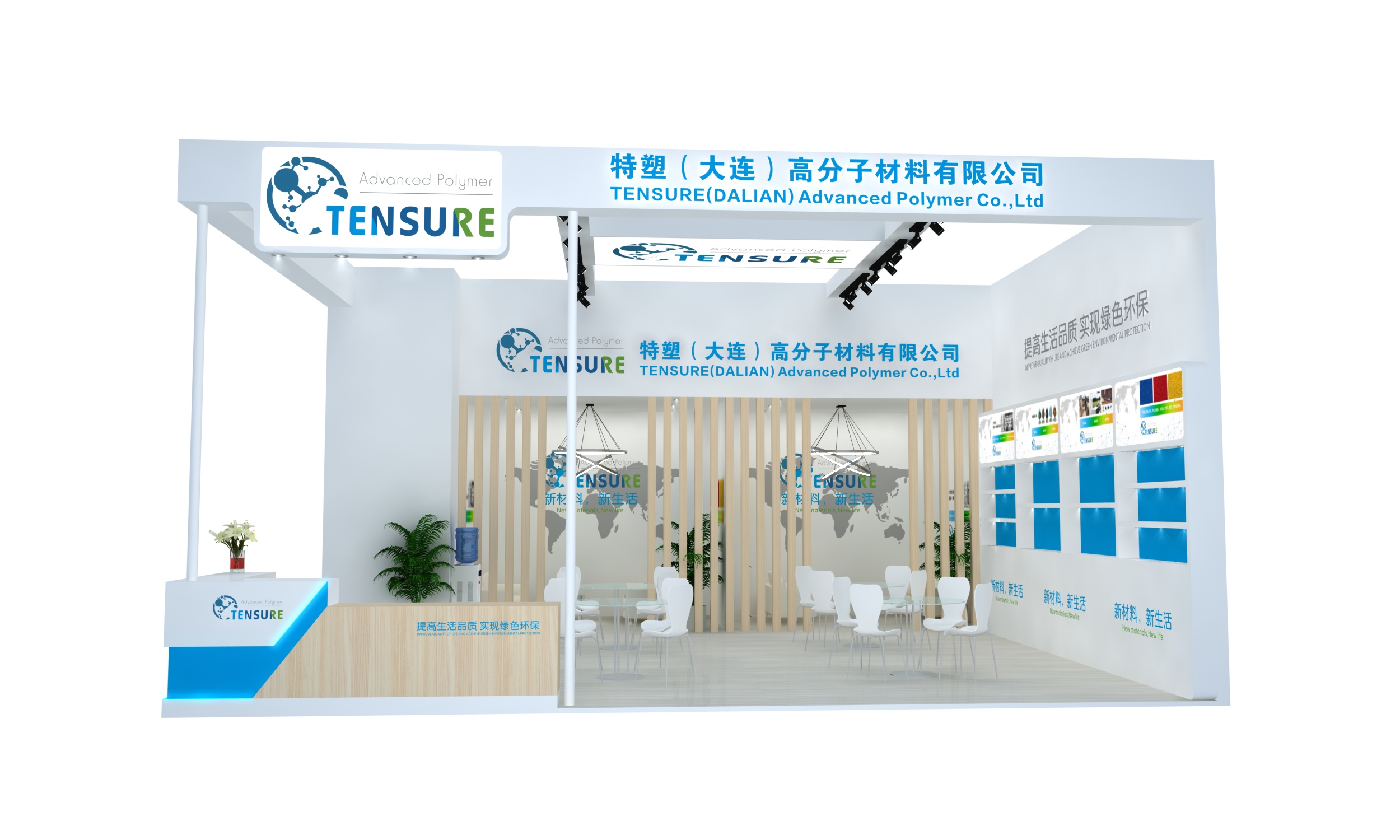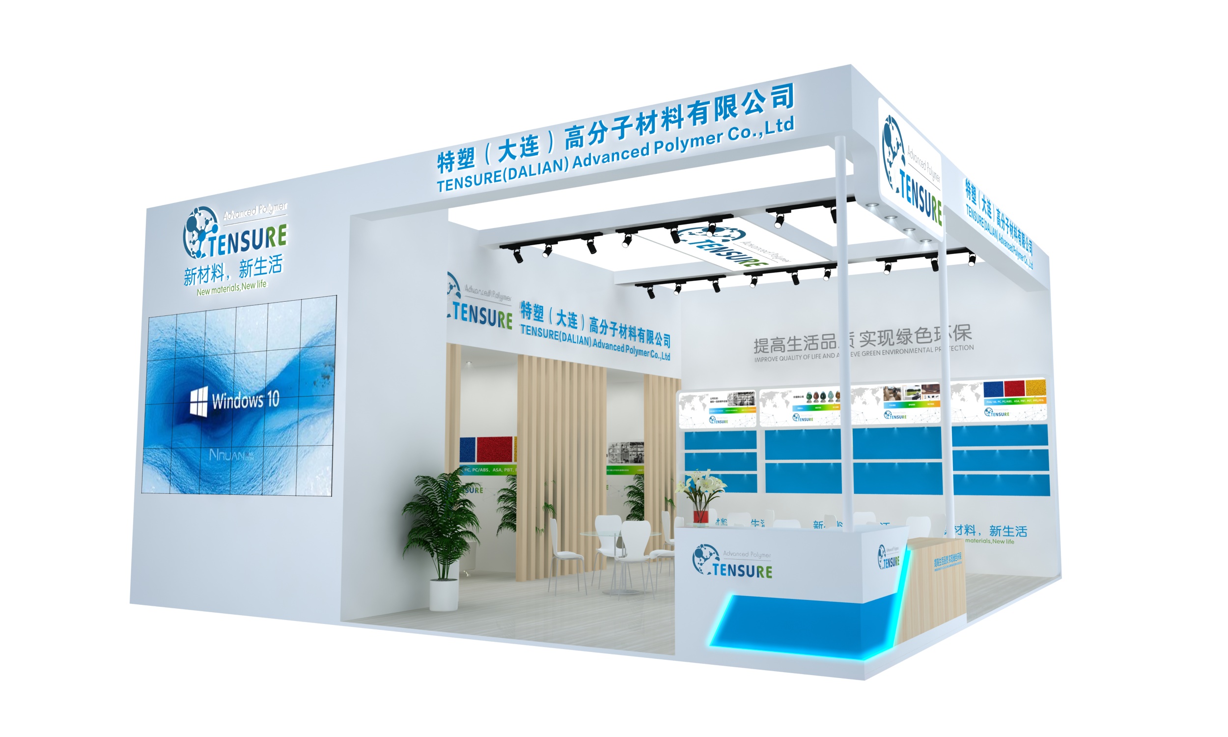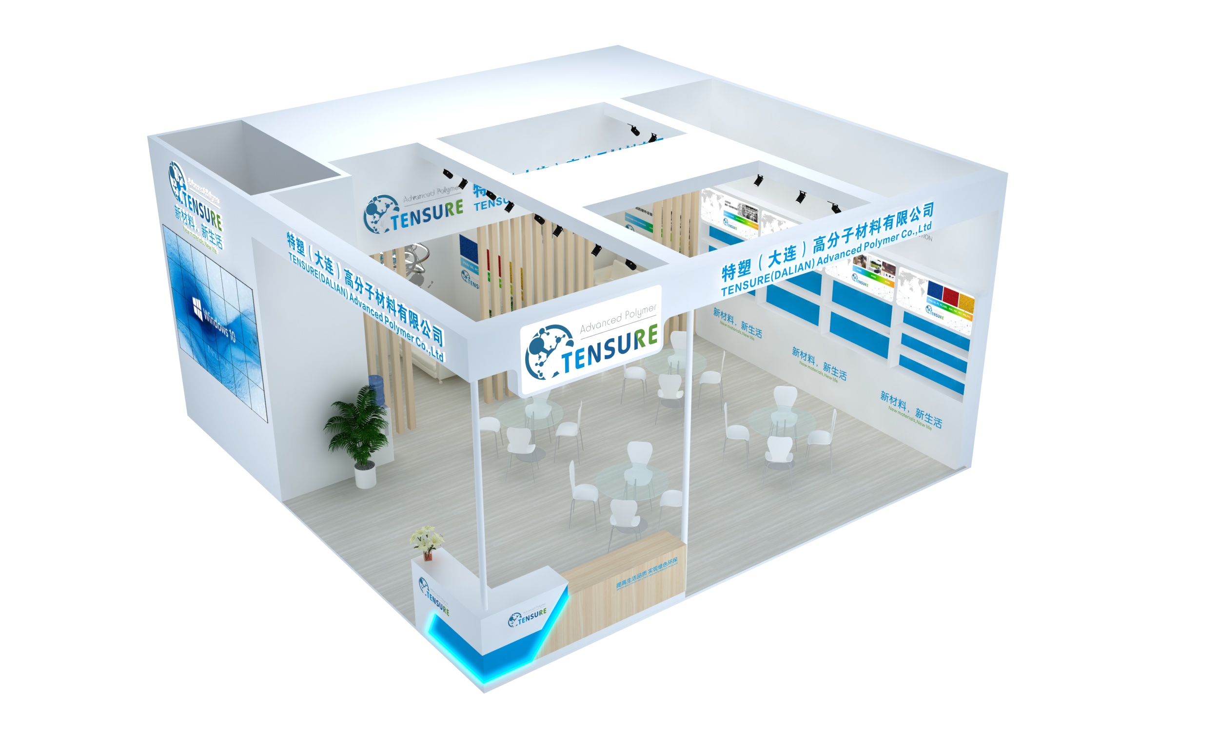 橡塑展会展台设计搭建,该展台功能区域包含接待区、洽谈区、存储区、品牌展示区